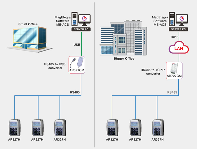 Flexible connection to suit you To make it simpler, you can loop multiple AR327H readers to the USB port of the PC using AR321CM (RS485-USB converter) in a small office or guardhouse setup. In a bigger office environment, you can loop multiple AR327H readers to the Local Area Network using AR727CM (RS485-TCPIP converter). Which one you like, USB or network?