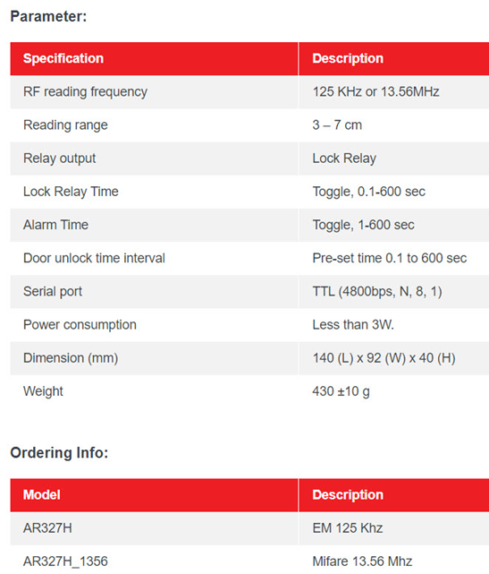 AR327H is a card access reader typically installed at door to restrict unauthorized access. It reads EM or Mifare proximity card. It supports an RS485 connection, 3000 users and 1500 event memory. It has a built-in illuminated touch panel keypad and LCD screen display.