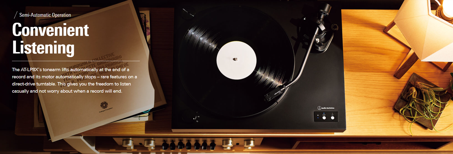 Audio-Technica expands its line of direct-drive turntables with the semi-automatic AT-LP8X, featuring a newly designed tonearm lift that automatically raises the tonearm at the end of a record side and stops the motor.