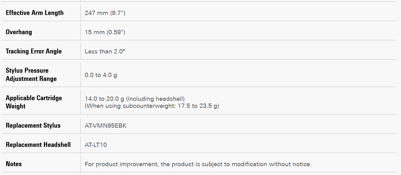 Included subcounterweight provides an expanded cartridge/headshell weight range of 14.0 g – 23.5 g