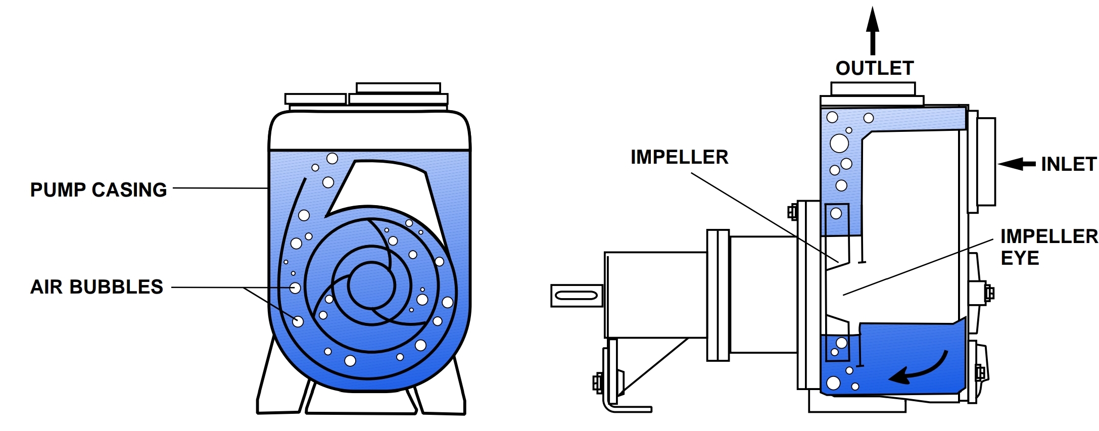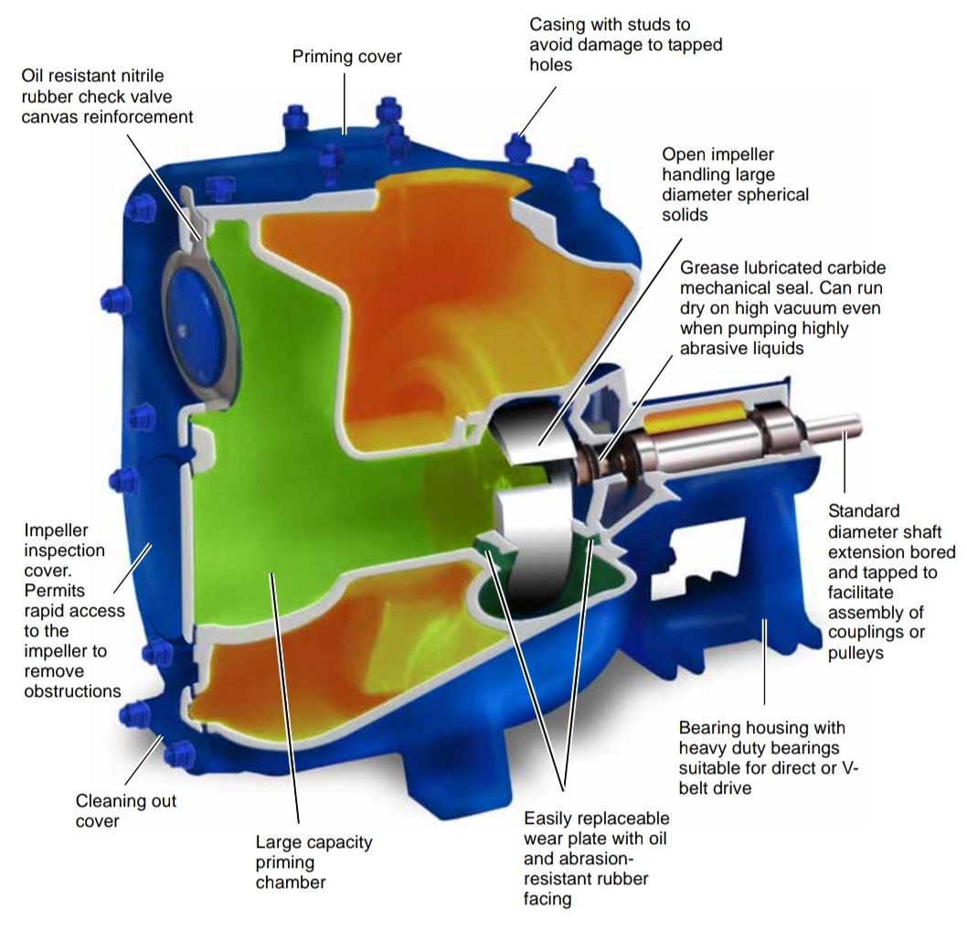 Solid passage size limit to 75mm (3 inches). The internal construction allows air to separate from water to achieve negative priming upon starting up.