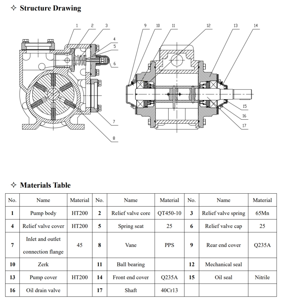 The use of nodular iron for the pump body and self-lubricating materials for the vanes ensures the pump's longevity and resistance to wear.