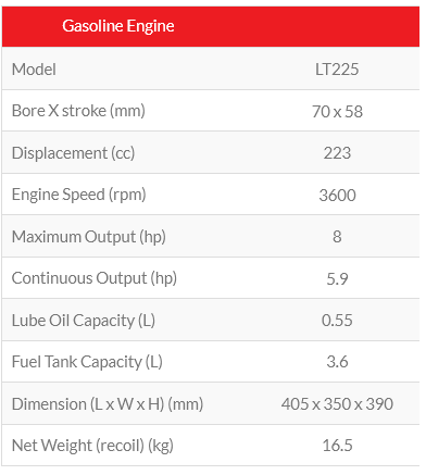 • Gasoline engine – compact in structure, small in size and fuel saving.