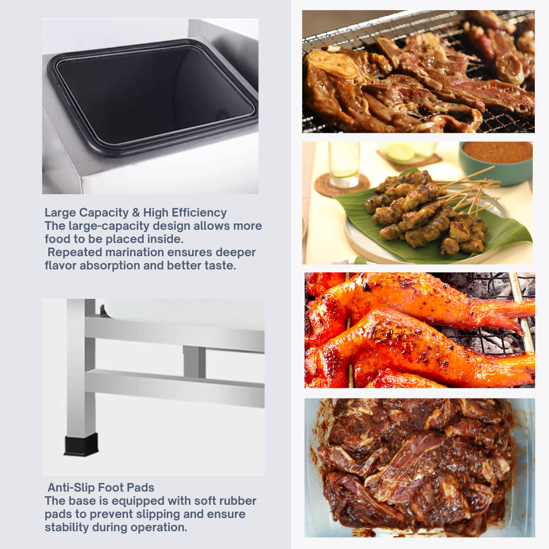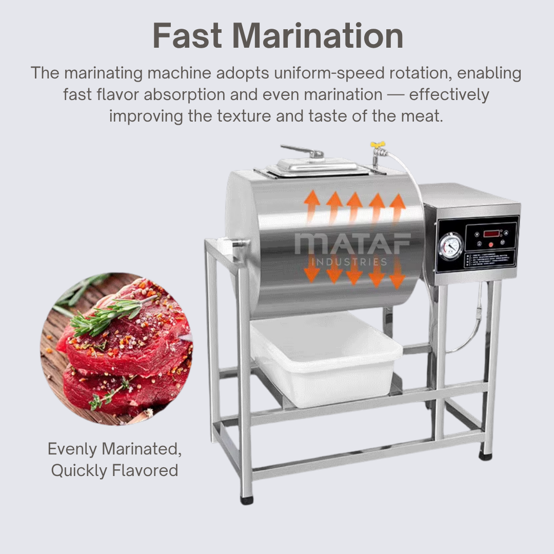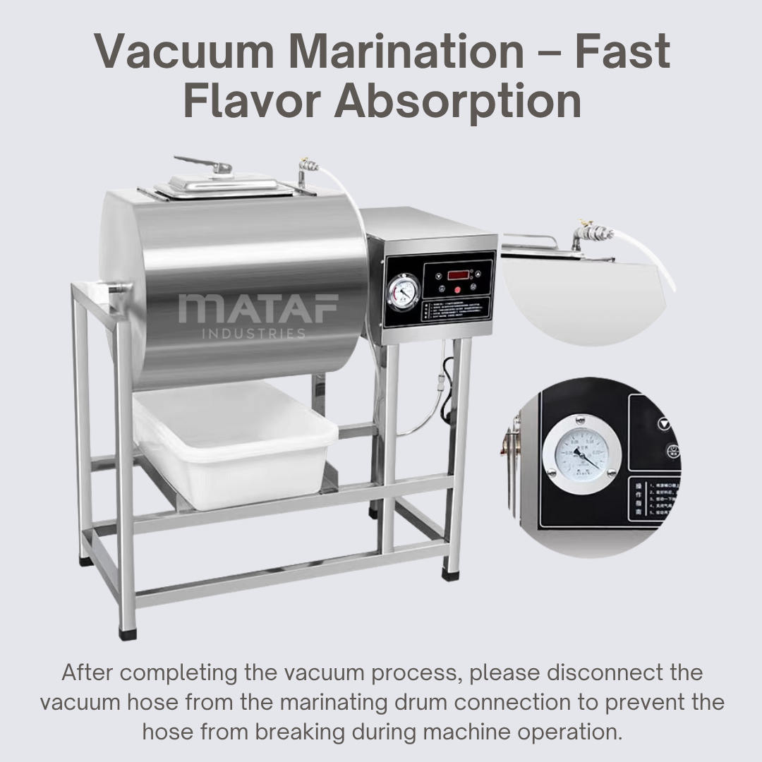The MATAF Vacuum Marinating Machine is engineered for efficiency, durability, and consistent flavor infusion. Made from thickened stainless steel, it ensures a long service life with strong bearing capacity. The detachable barrel design allows for easy cleaning, while the pure copper motor provides powerful and energy-efficient performance. Its vacuum system enables fast and thorough marination, allowing seasoning to penetrate deep into the food structure.