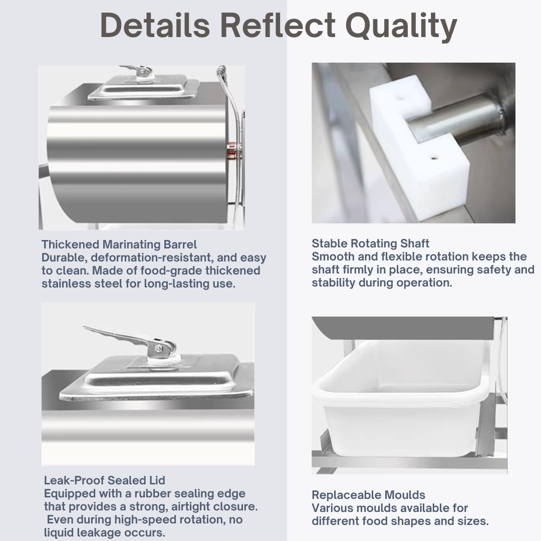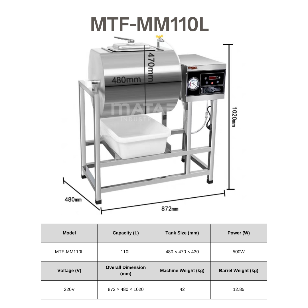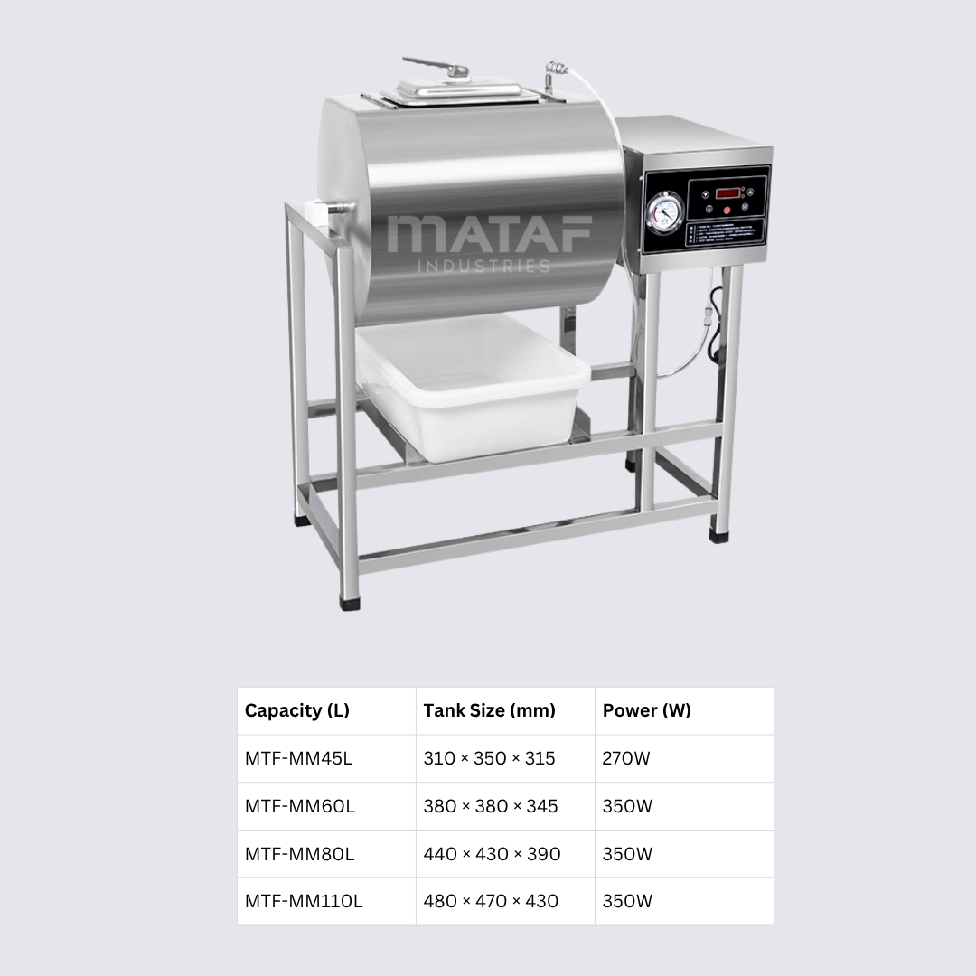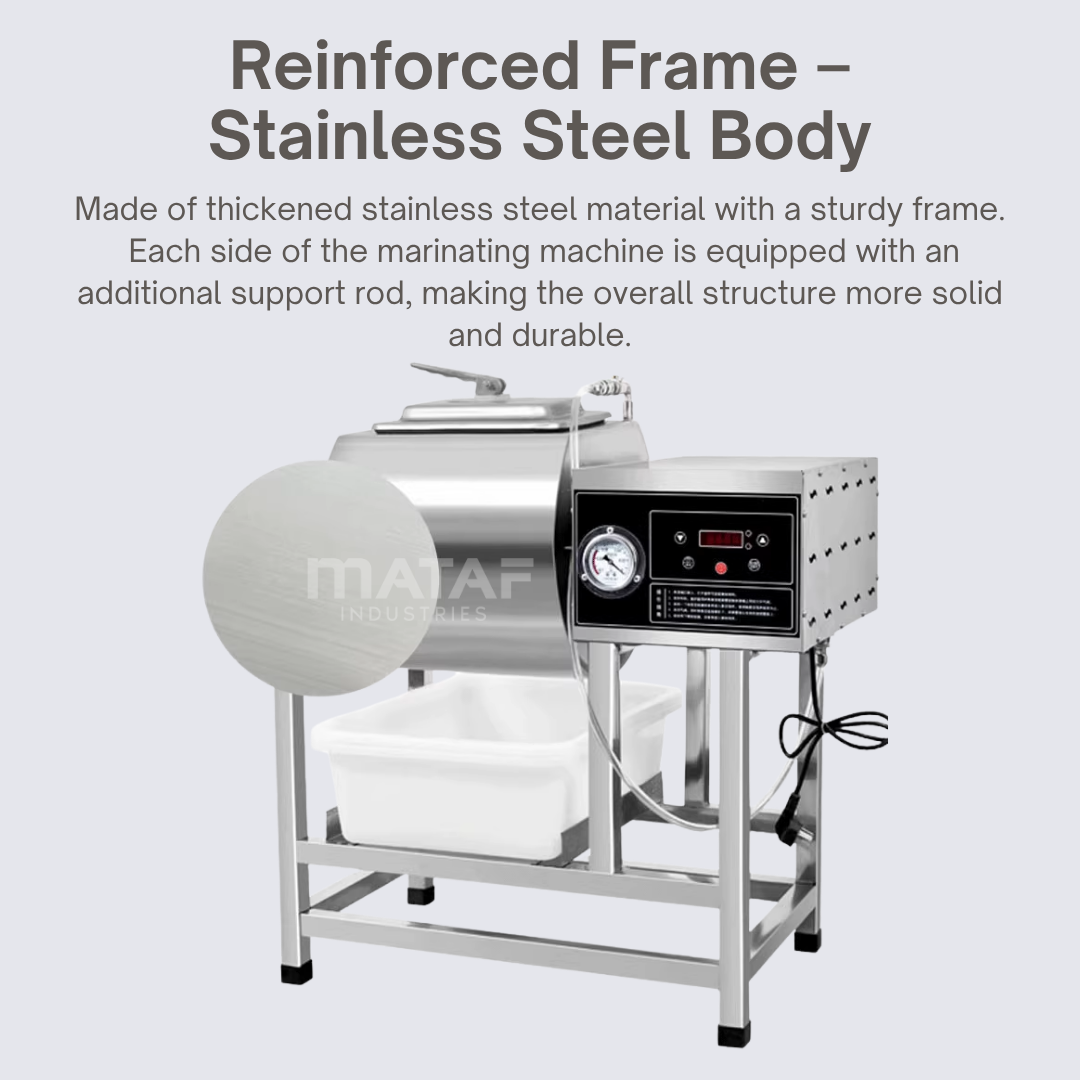 The MATAF Vacuum Marinating Machine is engineered for efficiency, durability, and consistent flavor infusion. Made from thickened stainless steel, it ensures a long service life with strong bearing capacity. The detachable barrel design allows for easy cleaning, while the pure copper motor provides powerful and energy-efficient performance. Its vacuum system enables fast and thorough marination, allowing seasoning to penetrate deep into the food structure.