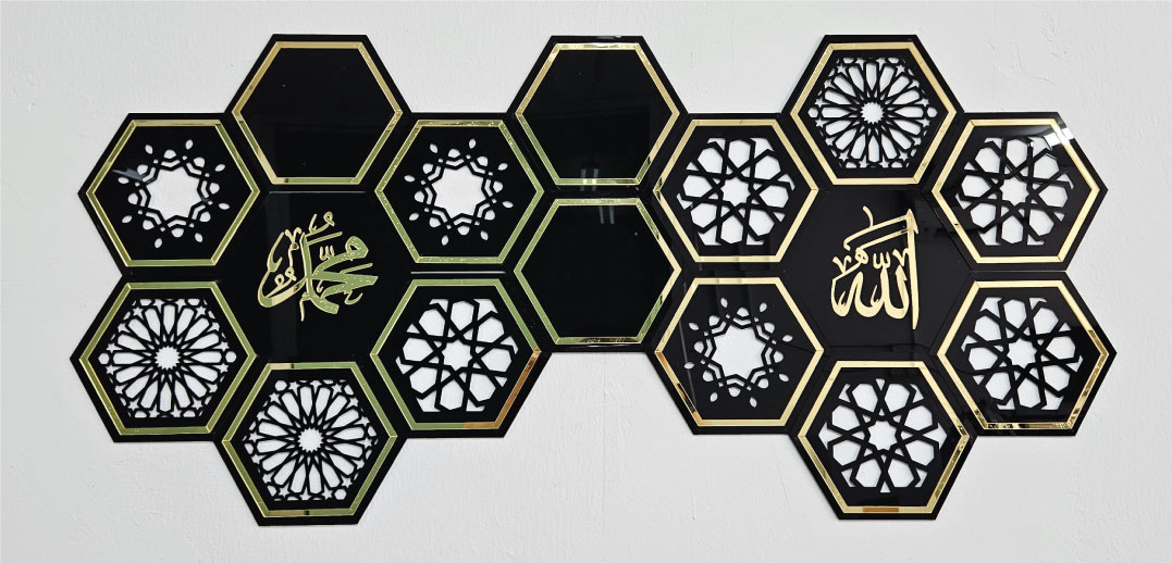 Characteristics of Islamic Decoration Panel: Size of each panel: 14.5 cm x 16.5 cm Material: 2mm Black Glossy Acrylic + 2mm Gold mirror Acrylic Easy installation. Simply attach Suitable for large or small wall spaces Lightweight acrylic, easy to transport, ready to install and display Suitable for home/room/entrance door/office/restaurant wall decoration Suitable as a gift or souvenir Suitable for large or small wall spaces Ciri Ciri Panel Dekorasi Islam: Saiz setiap panel: 14.5 cm x 16.5 cm Bahan : 2mm Black Glossy Acrylic + 2mm Gold mirror Acrylic Mudah pasang . Hanya Cantum Sahaja Sesuai untuk ruang dinding besar atau kecil Acrylic ringan & mudah dibawa, siap dipasang dan dipamerkan Sesuai untuk hiasan dinding rumah/ bilik/ pintu masuk/ pejabat/ restoran Sesuai sebagai hadiah dan cenderahati Sesuai untuk ruang dinding besar atau kecil --------------------------------------------------