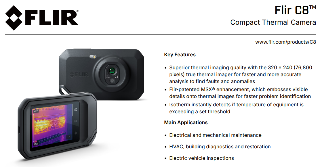 Flir C8 is a thermal imaging camera designed for electrical and mechanical maintenance, vehicle inspections, and other troubleshooting applications. Featuring 320 × 240 thermal resolution with MSX® detail enhancement, the C8 captures sharp thermal images for accurate diagnostics. Identify hidden problems with isotherm, which instantly detects if a temperature is exceeding a threshold. Built-in Flir Ignite™ cloud connectivity allows direct data transfer, storage, and backup, so images are always available on all your devices, as well as live streaming via USB. The 3.5 inch integrated touchscreen is simple to use, so you can quickly inspect, document repairs, and share evidence with customers. With the Flir C8 in your pocket, you’ll be ready anytime to find hot fuses, air leaks, plumbing issues, and more.
