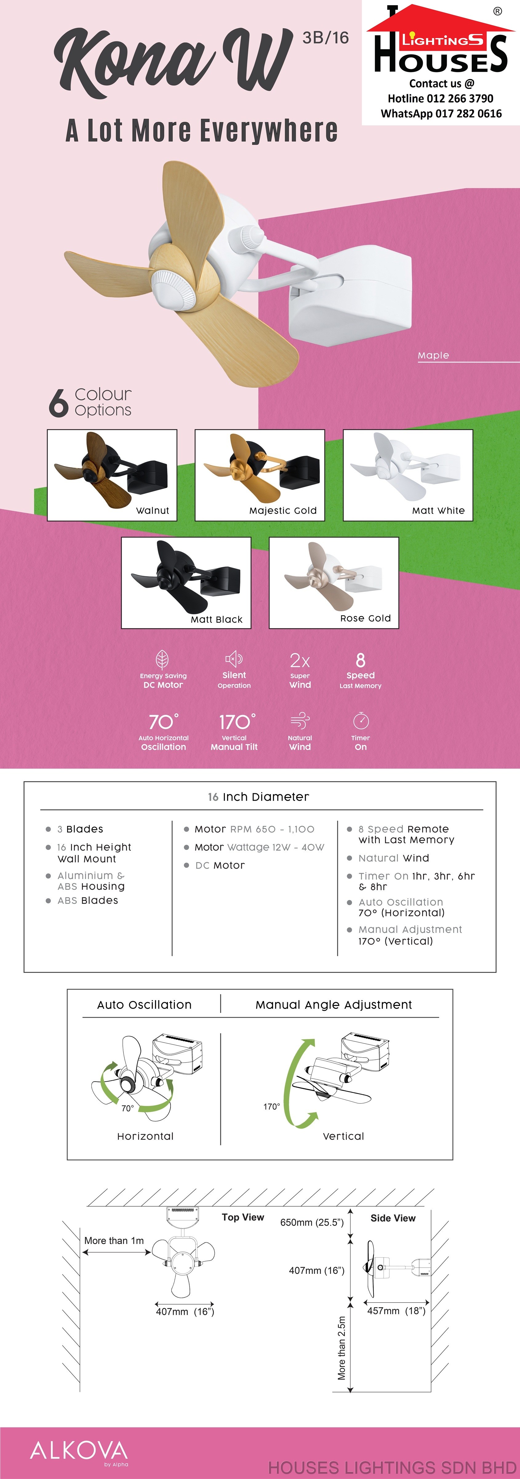 ALPHA Alkova - KONA W 16 Inch DC Motor - Wall Fan with 3 Blades (8 Speed Remote) - Walnut