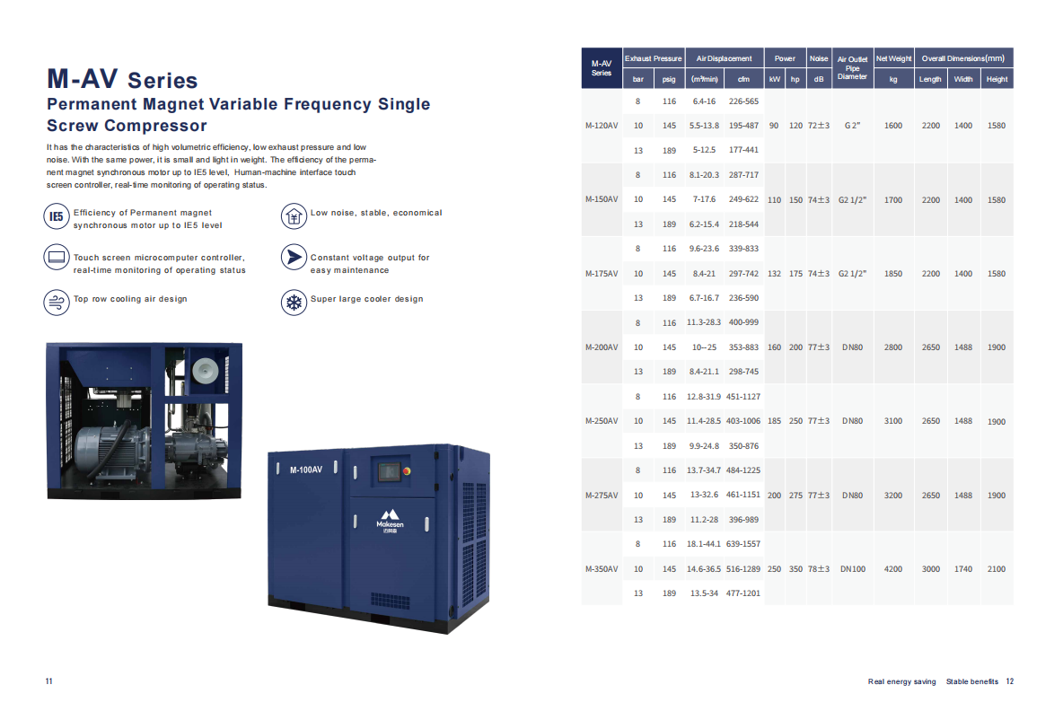 Discover the MAKESEN M-AV Series Permanent Magnet Variable Frequency Single Screw Air Compressor, engineered for superior energy efficiency, stable performance, and long service life. This advanced compressor is designed to reduce power consumption while delivering consistent air supply, making it the ideal choice for manufacturing, industrial production, and heavy-duty applications.