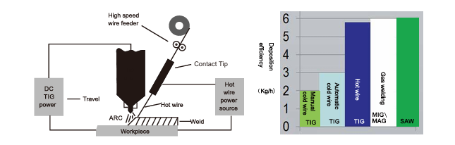 Hot wire TIG is designed based on cold wire TIG by adding one hot wire power source to pre-heat wire (300-400'C), Without increasing base metal heat input, by increasing wire filling rate, the welding speed is almost close to MIG.