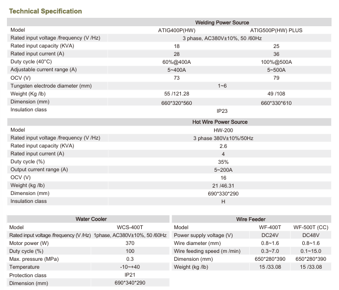 ATIG-400P(HW) /500P(HW) PLUS hot wire TIG system is a TIG welding equipment with high efficiency and high quality. It is a semi- automatic or automatic TIG welding system consisting of a welding power source, hot wire power source, wire feeding mechanism and special welding torch. Compared with cold wire TIG, it enjoys one time improved welding deposi tion rate and the same welding speed as MIG, which makes it become the best choice for high-quality and high-speed application of carbon steel/stainless steel/titanium alloy welding.
