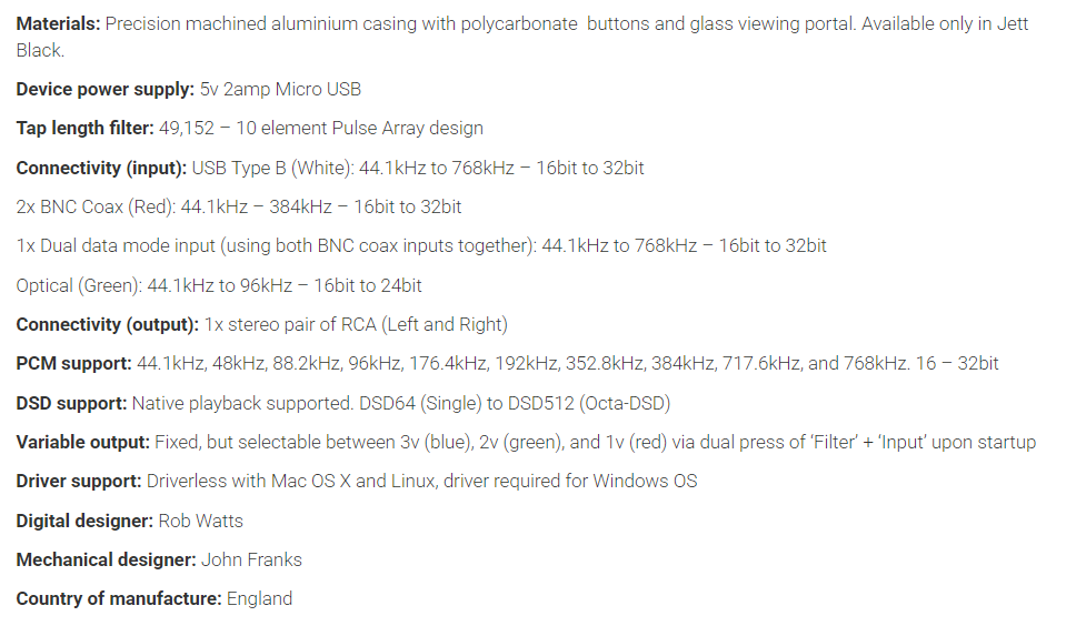 Chipset: Chord Electronics custom coded Xilinx Artix 7 (XC7A15T) FPGA
