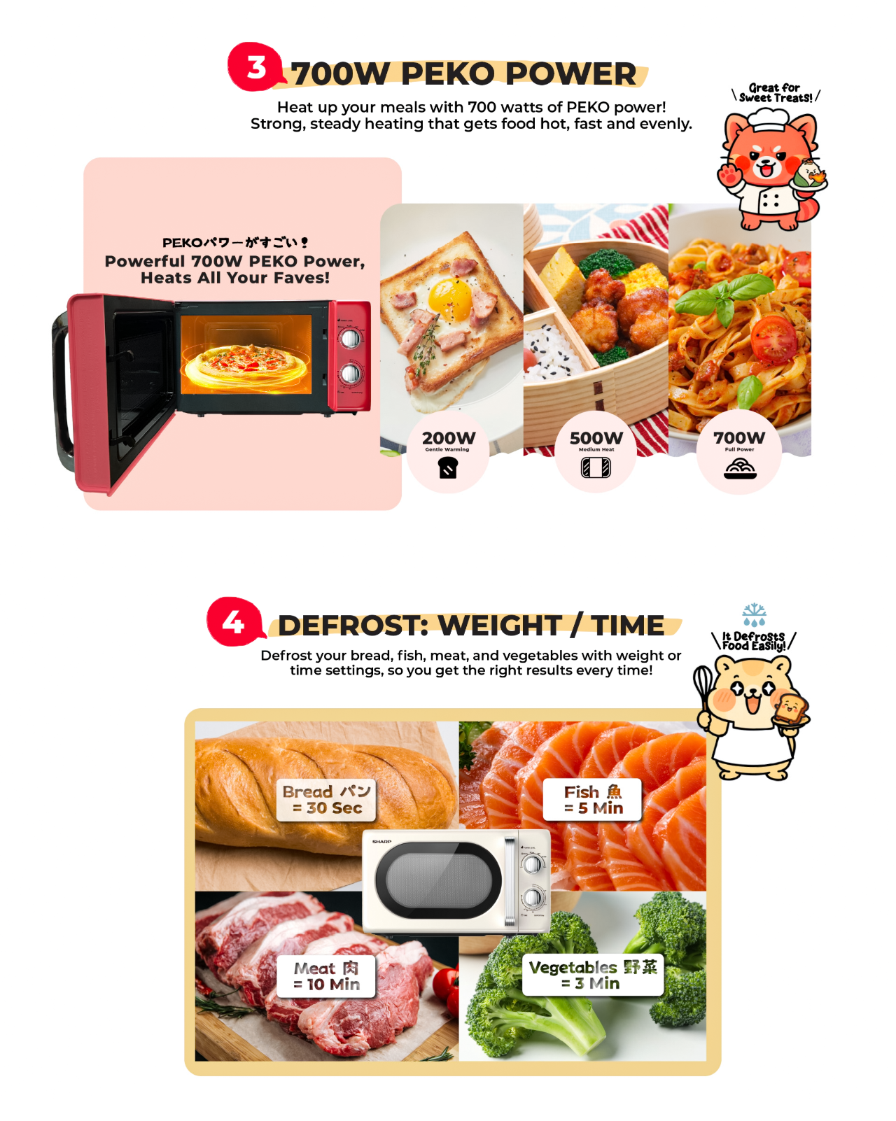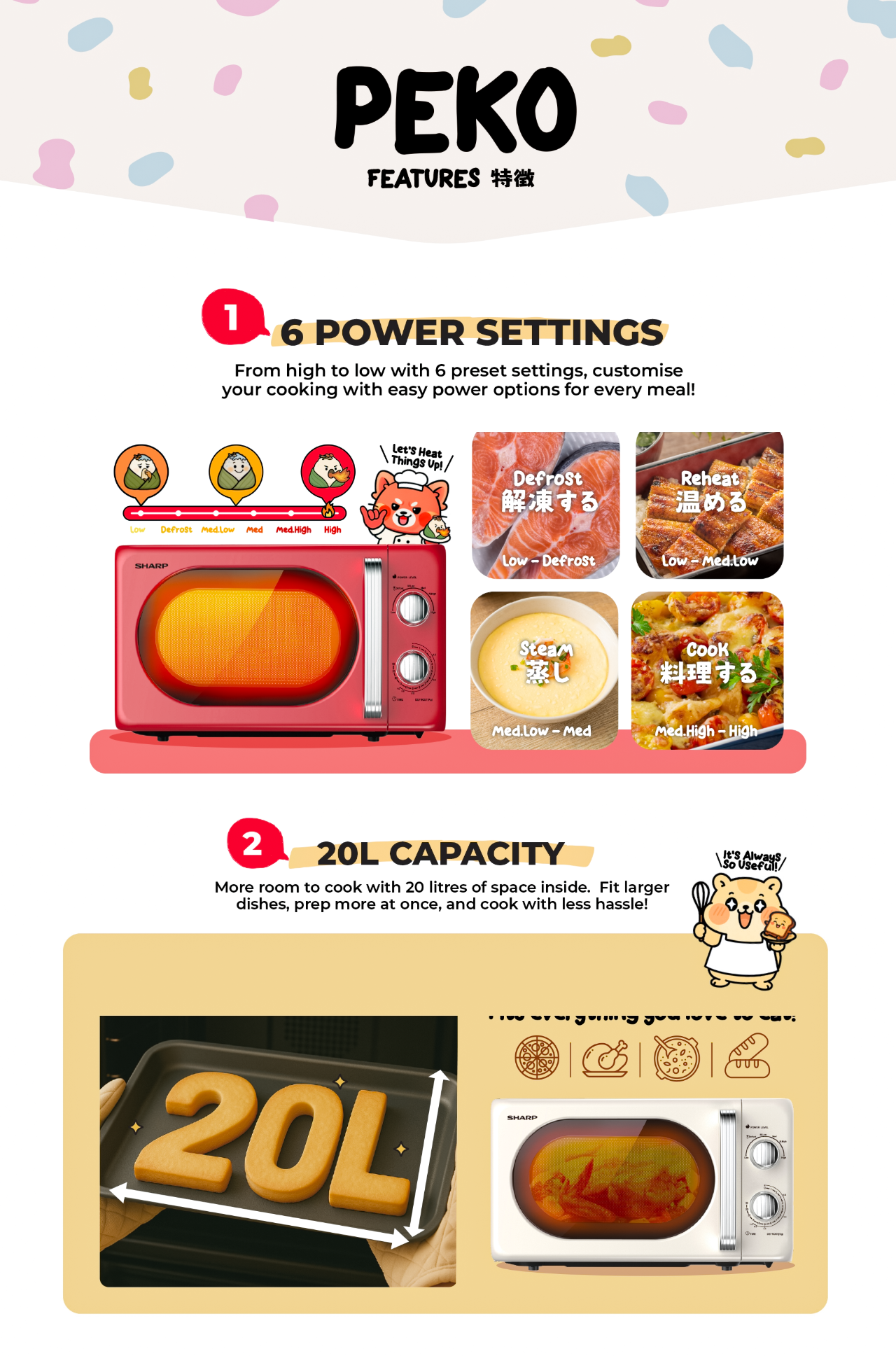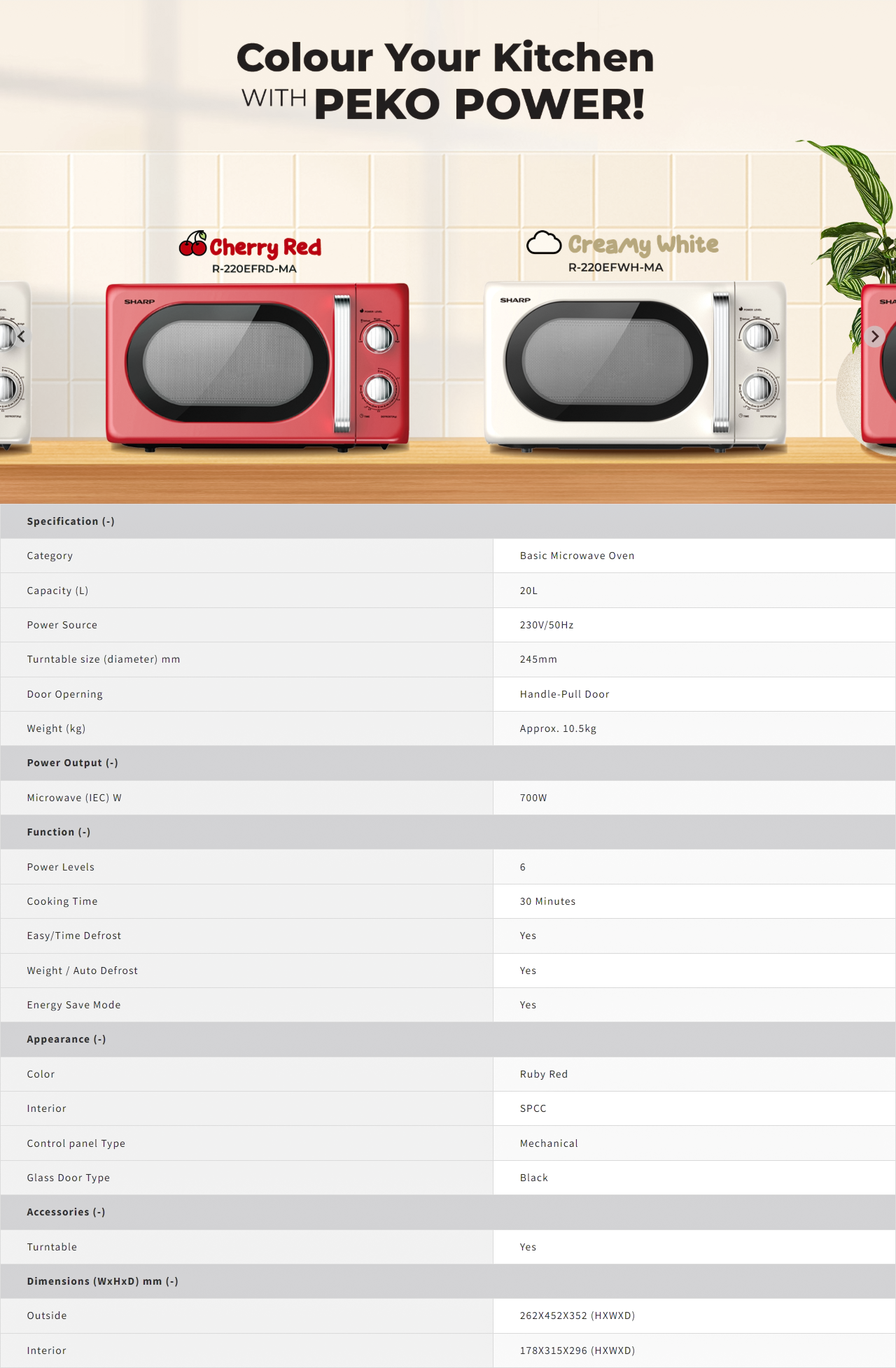 Simple mechanical dials – just turn and start 6 power levels for flexible cooking 700W power, good for everyday use A large 245mm glass turntable for even heating Grey-painted cavity for better heat reflection and long lasting
