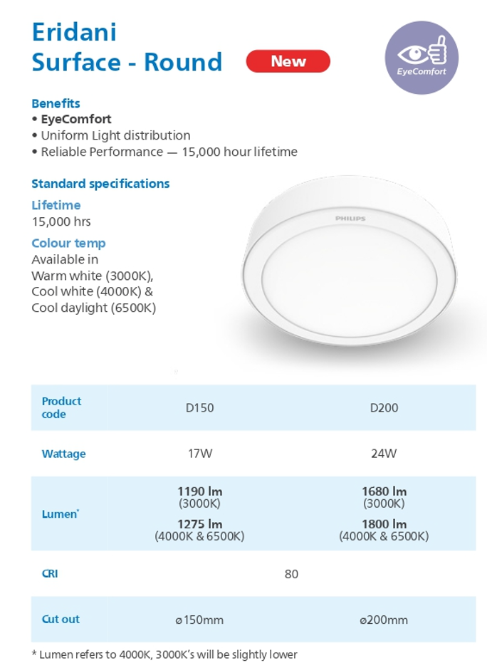 Illuminate your space with the (NEW) Philips Eridani Surface LED Downlight Round CRI80 15,000Hrs [D150/D200] [17W/24W] [1190LM/1275LM/1680LM/1800LM] [3000K/4000K/6500K], designed to deliver bright, efficient, and comfortable lighting for modern environments.