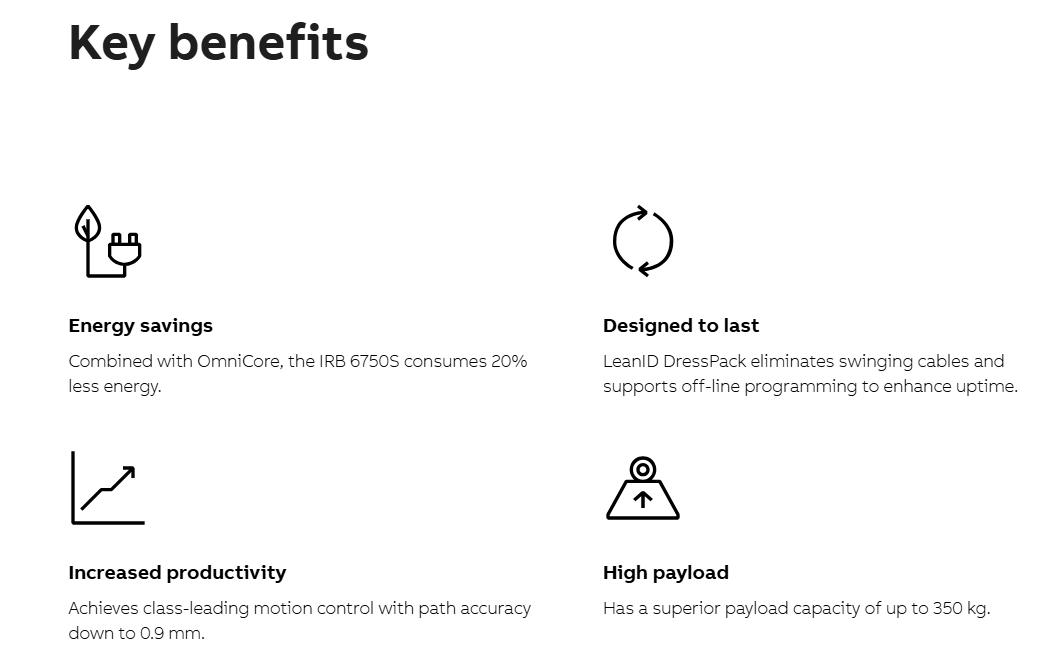 The IRB 6750S comes with a heightened focus on efficient modular design and energy savings of up to 20%1, while delivering world-class performance and quality. The robot optimizes space as it can be mounted at a height position and has increased downward reach, bringing flexibility to the maximum. Capable of handling a superior payload capacity of up to 350kg, the robot is ideal for material handling, die casting and welding applications.