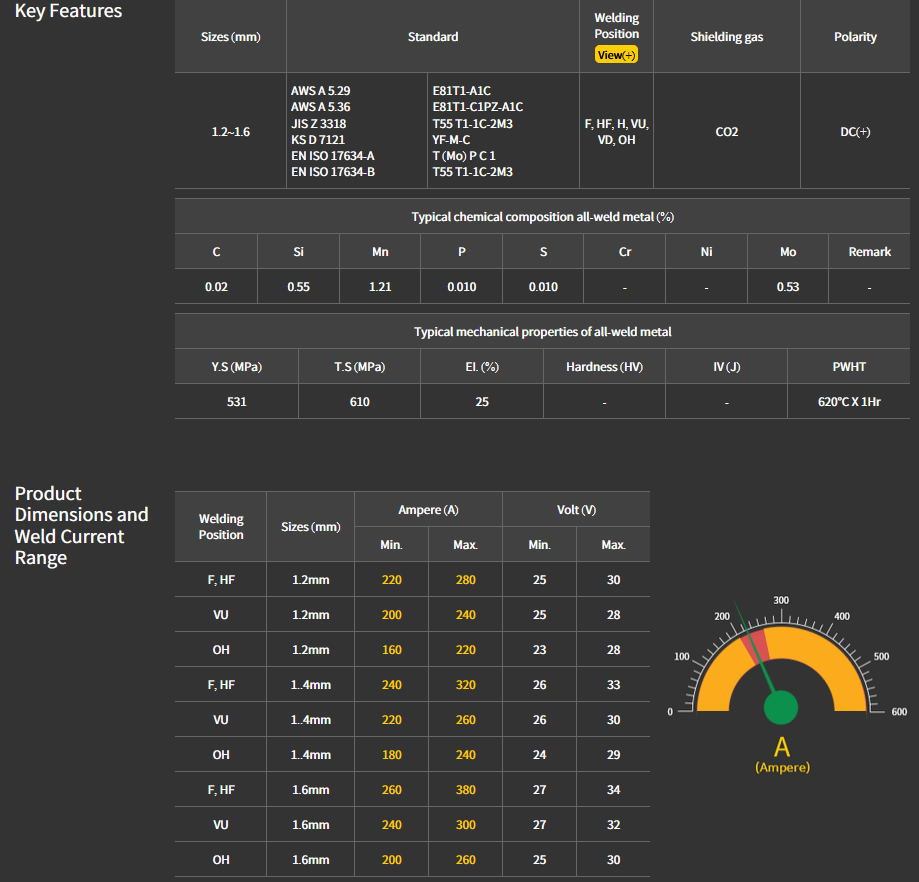 For 600Mpa Grade 0.5% Mo Heat resisting steel, Arc is stable with 100%CO2 gas. Spatter is very low. Slag removal is excellent