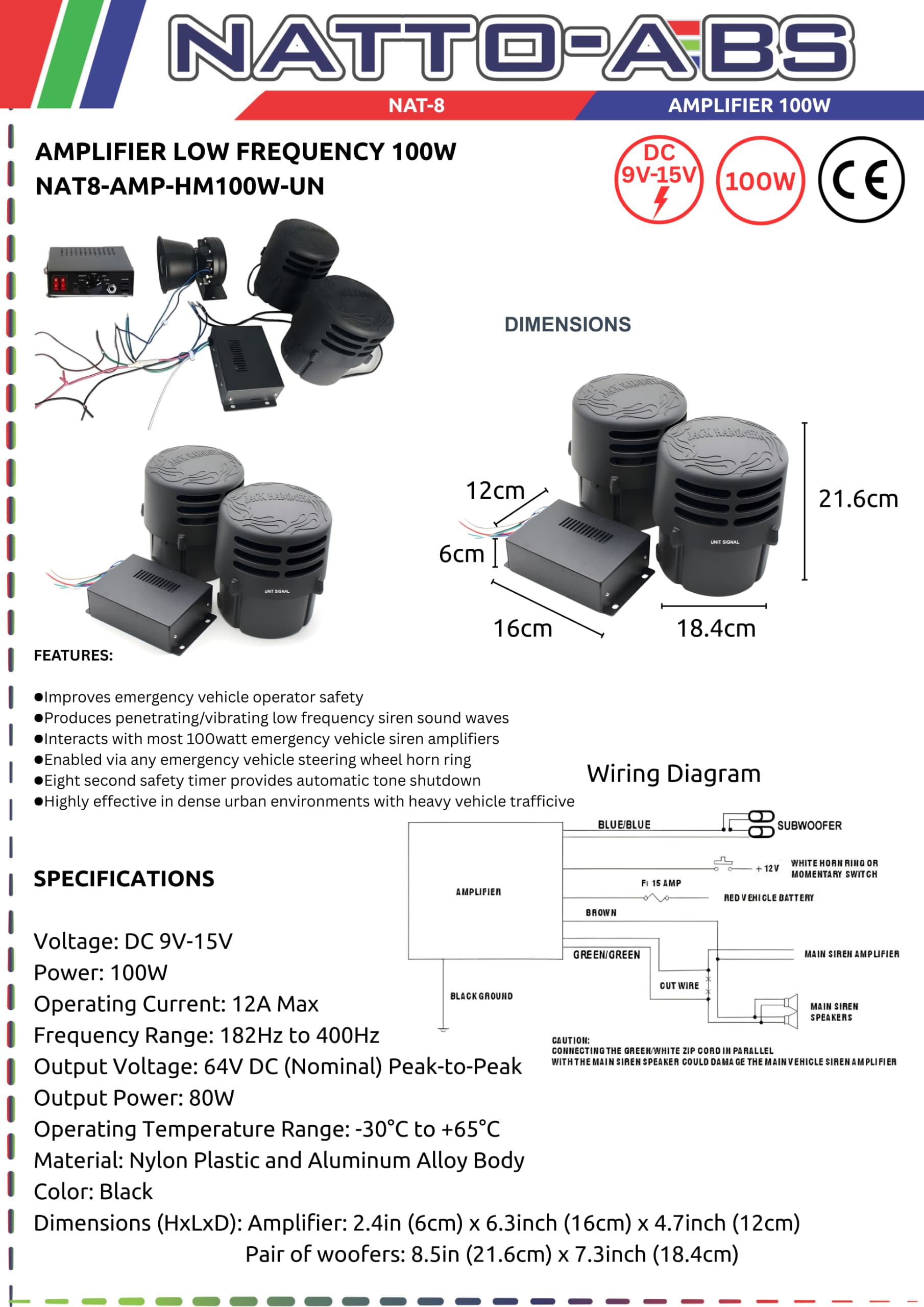 Compatible with most 100W emergency vehicle siren amplifiers