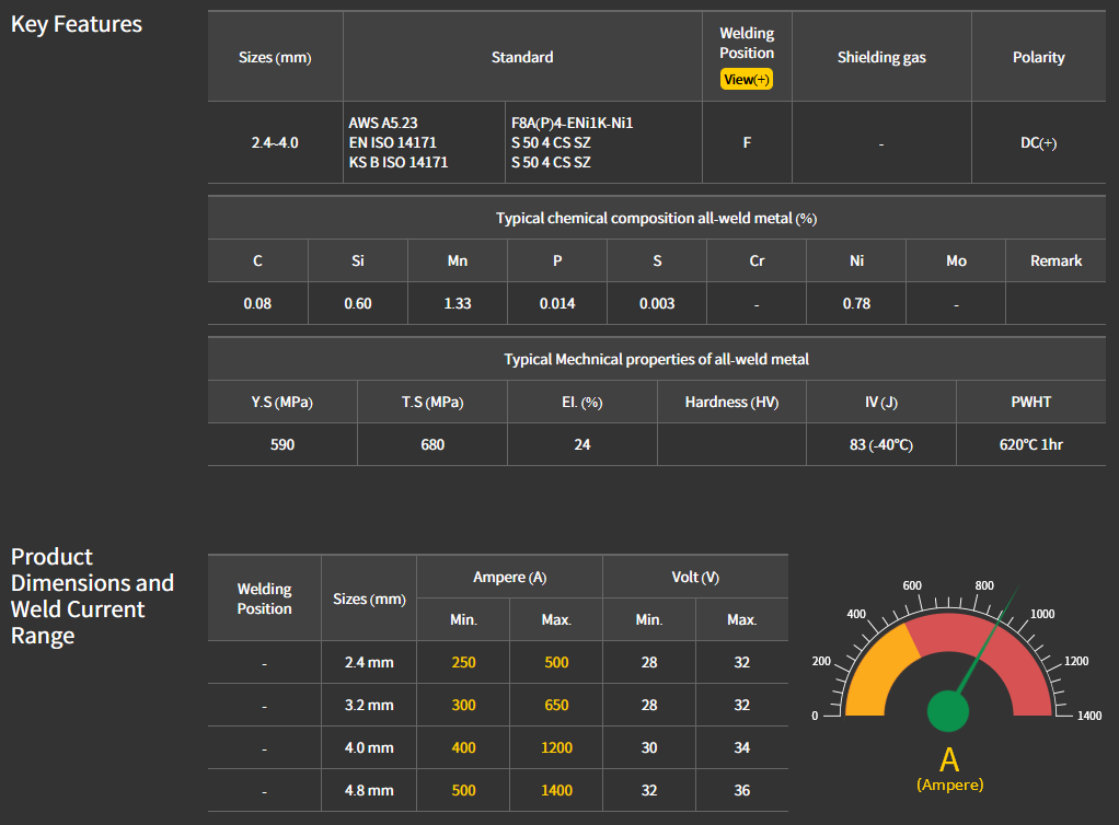 - AWS: A5.23 : F8A(P)4-ENi1K-Ni1