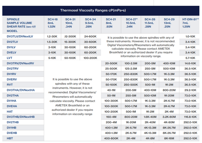 Spindle Types (Sample Volume in mL) and Viscosity Ranges (cP/mPa·s):