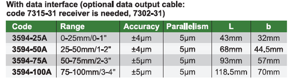 INSIZE - Digital Non-Rotating Spindle Disk Micrometer 3594 Series Brand: Insize Model: 3594-25A, 3594-50A, 3594-75A, 3594-100A Features: Technical Specification: