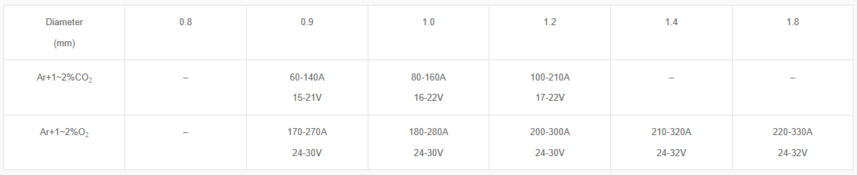 - Use Ar blend with 1~2%O2 for high current, spray transfer welding