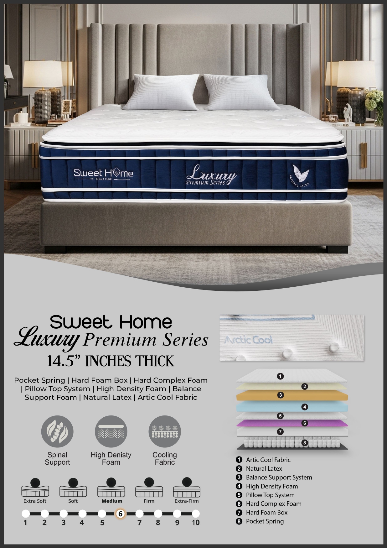 Experience a new level of comfort with the Sweet Home Luxury Premium Series, a 14.5-inch premium mattress designed for superior spinal support, long-lasting durability, and luxurious hotel-style comfort. Perfect for homes, hotels, serviced apartments, and anyone seeking a cooler, healthier, and more supportive sleep.