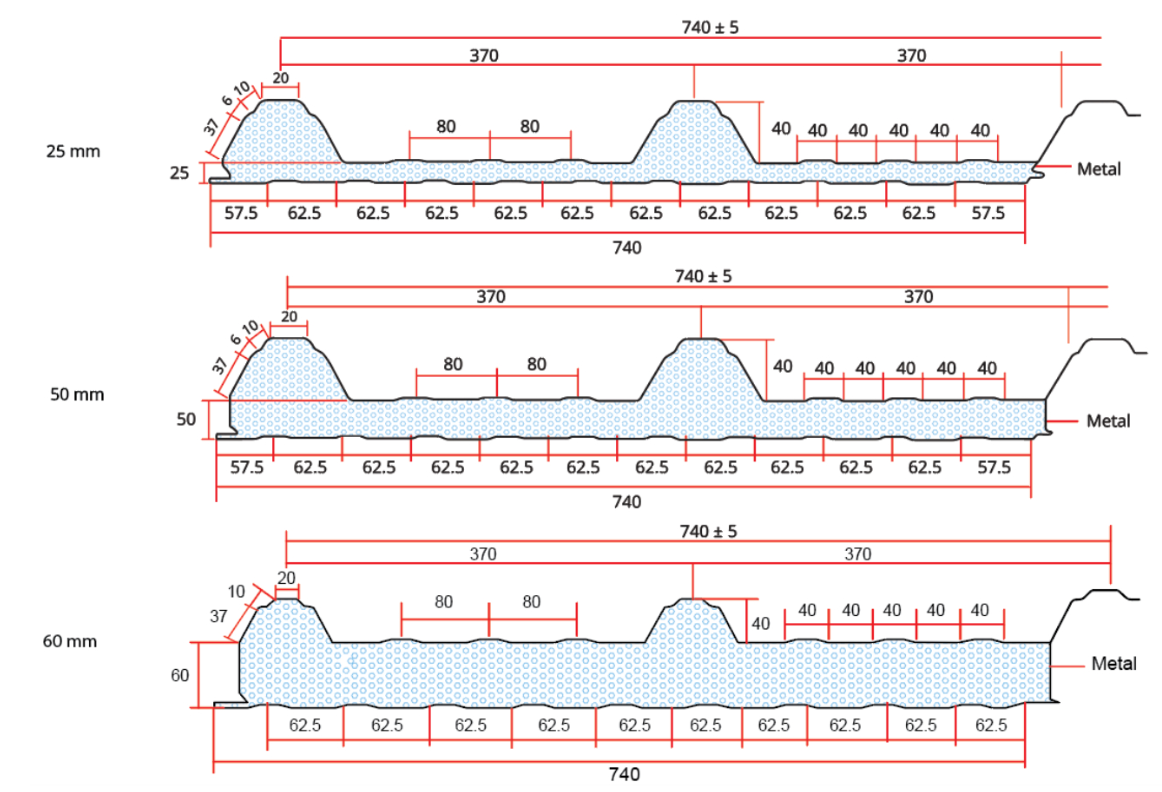 features a 3-layer insulation system with rigid PU foam sandwiched between two pre-painted metal sheets. Made of high-tensile steel with a 40mm trapezoidal profile, it can be installed on roofs with as low as 1° pitch without leakage. The premium design allows larger spans, fewer fasteners, and faster installation.
