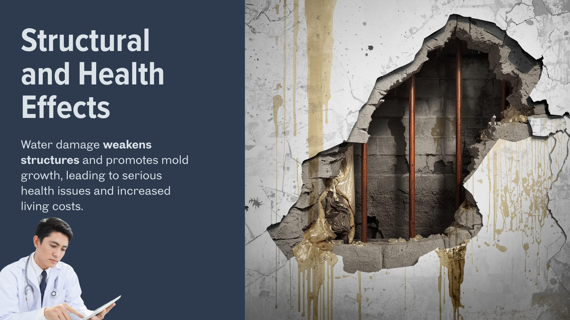 渗入房屋的水会破坏房屋的结构完整性。渗入地基墙体的水分会削弱周围的土壤。这会导致地基沉降、墙体开裂,甚至可能导致结构性损坏。[4]房屋内部,漏水会侵蚀金属部件,尤其是混凝土中的钢筋,从而削弱房屋的强度。[5]。