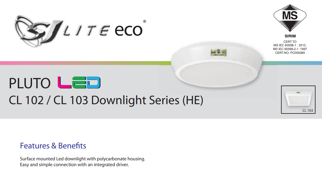 SJLITE CL102/103 PLUTO SERIES LED SURFACE DOWNLIGHT HE 240V 25,000HRS IP20 CRI80 [12W/18W] [1050LM/1075LM/1530LM/1600LM] [3000K/4000K/6500K] [ROUND/SQUARE] (SIRIM APPROVED)