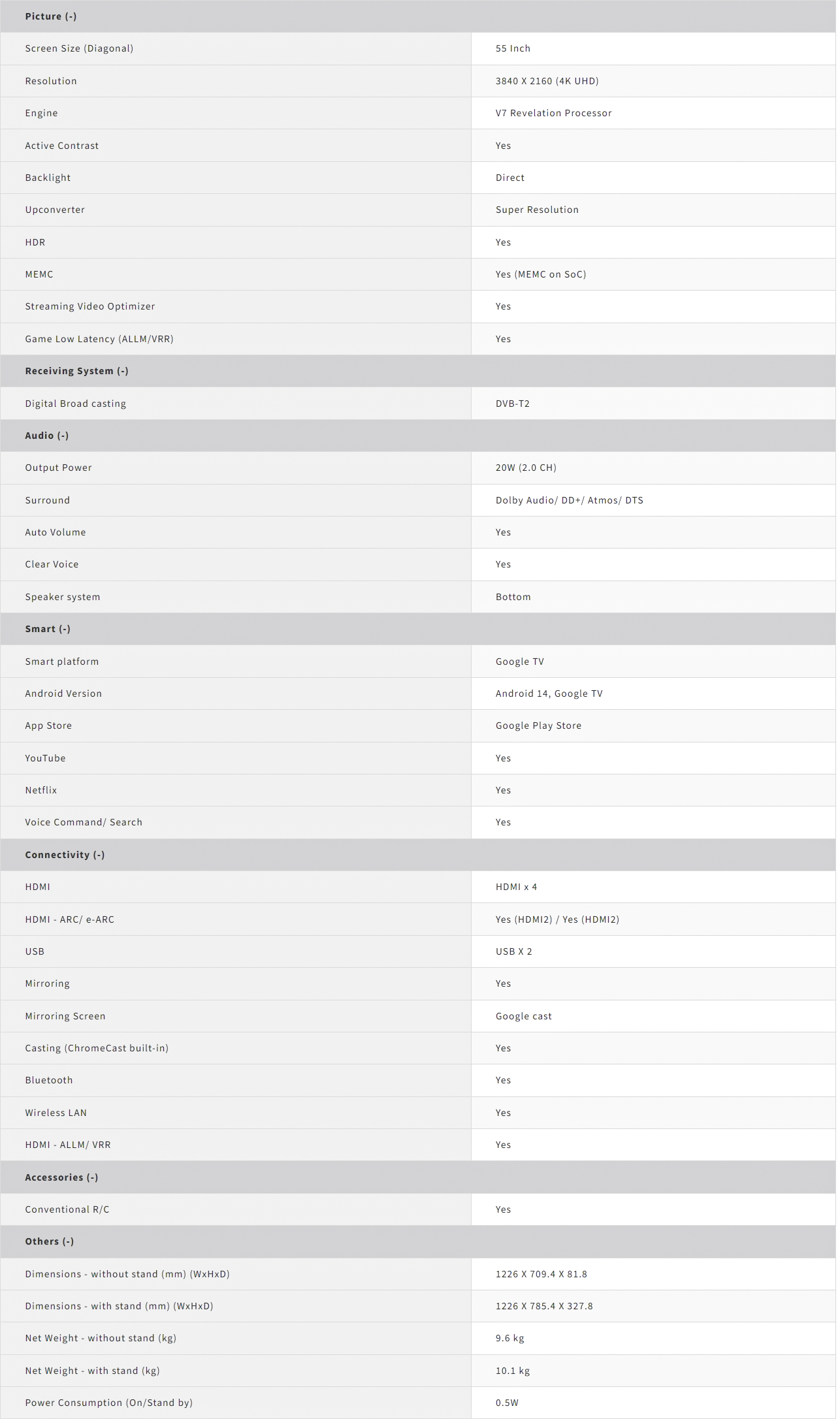 - V7 Revelation Processor- V7 Revelation Processor supports picture and audio enhancement technology for a rich viewing experience, including Dolby Vision, Dolby Atmos, MEMC and DT
