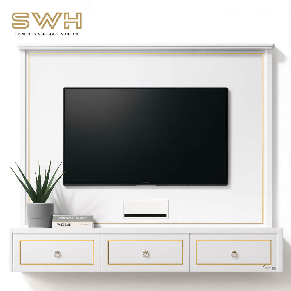 A modern wall-mounted TV cabinet with a full backboard panel and multi-compartment storage, suitable for living rooms, hotel suites, studio units, showrooms, and office lounges.