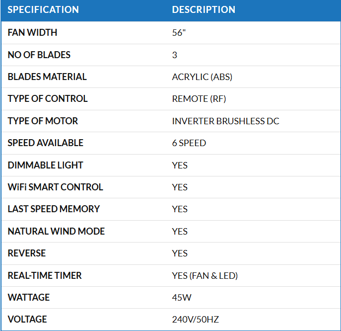 The MAVA Spivo 52 takes everything you love about the Spivo 42 and scales it up for larger spaces. Carrying the same sleek design and smart features, this bigger version delivers even stronger wind flow and higher air volume, making it ideal for living rooms, dining areas, or open spaces that need wider coverage. With its inverter DC motor, multiple speed settings, dimmable LED lighting, and smart control options, it offers the same quiet efficiency and modern convenience as the 42 — but with extra reach and power to keep every corner comfortably cool.