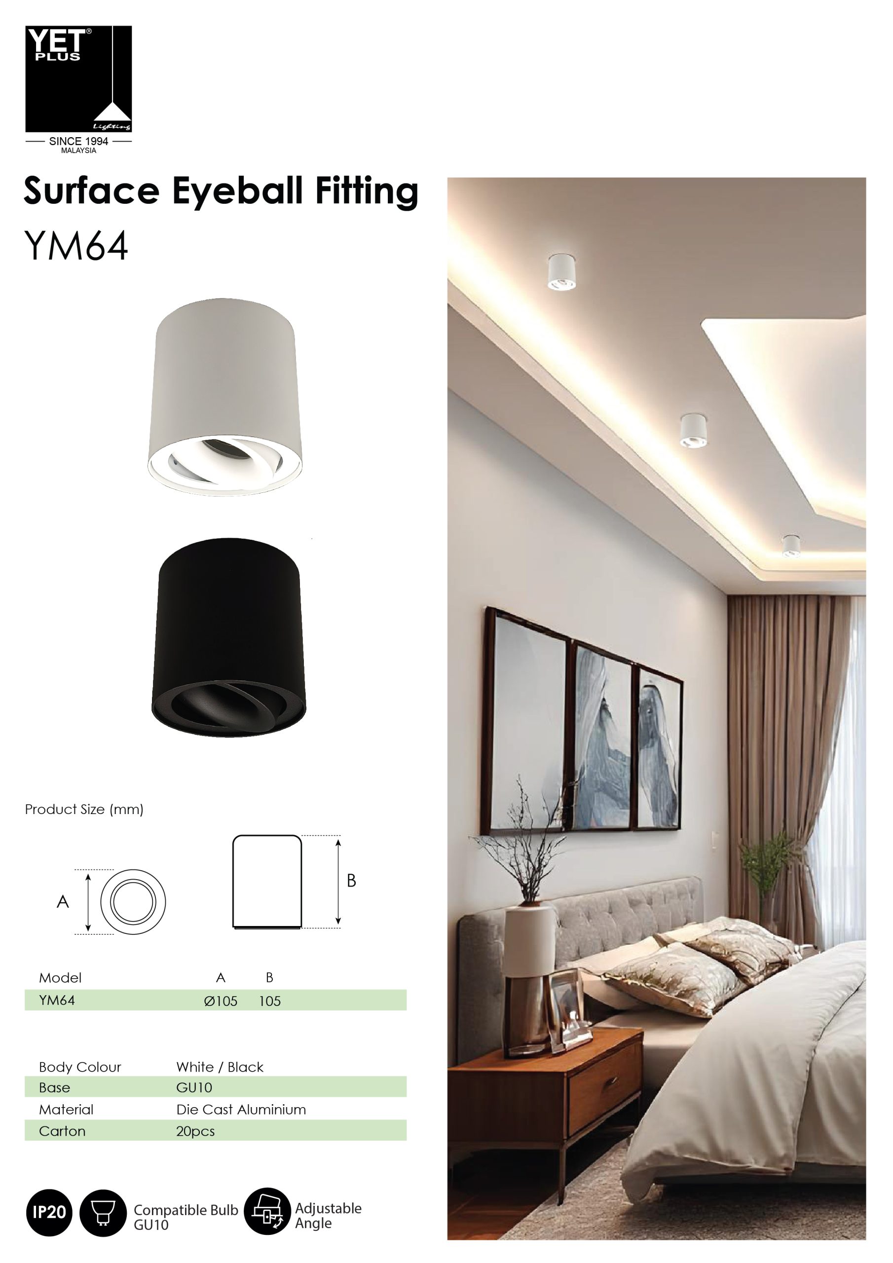 The YETPLUS YM65 Die Cast Aluminium GU10 Surface Eyeball Fitting IP20 [BLACK / WHITE] is a premium, surface-mounted spotlight designed to deliver adjustable, focused, and efficient illumination for modern interior spaces. Made from high-quality die-cast aluminium, this GU10 surface eyeball fitting offers superior durability, excellent heat dissipation, and a refined contemporary finish suitable for both residential and commercial environments.