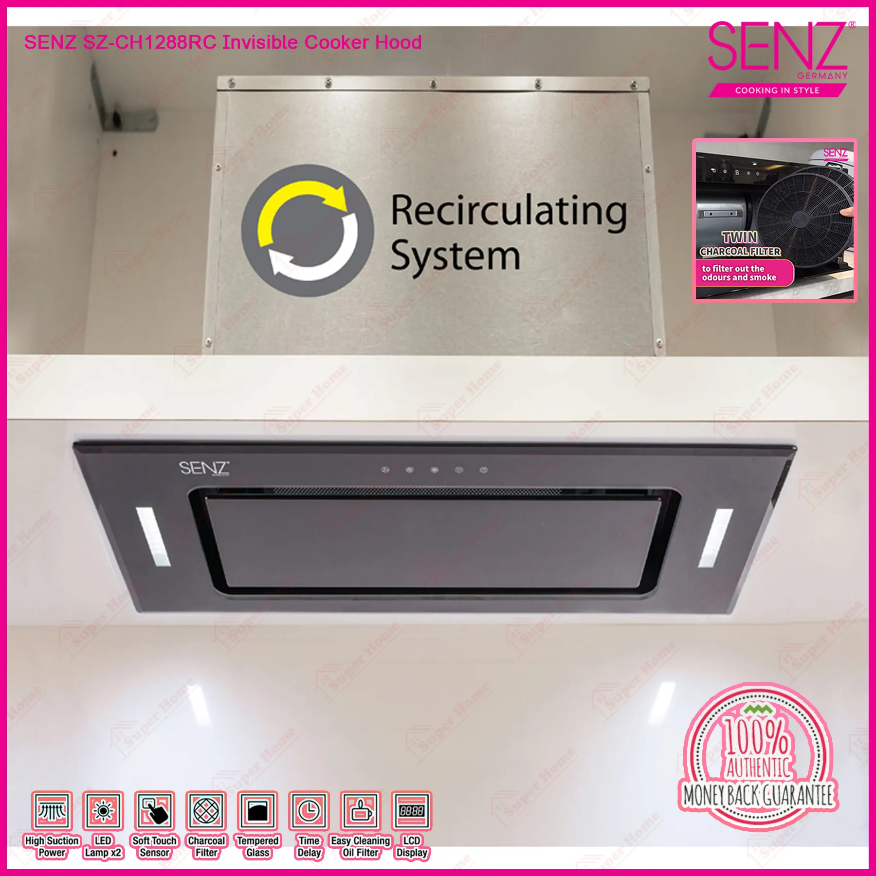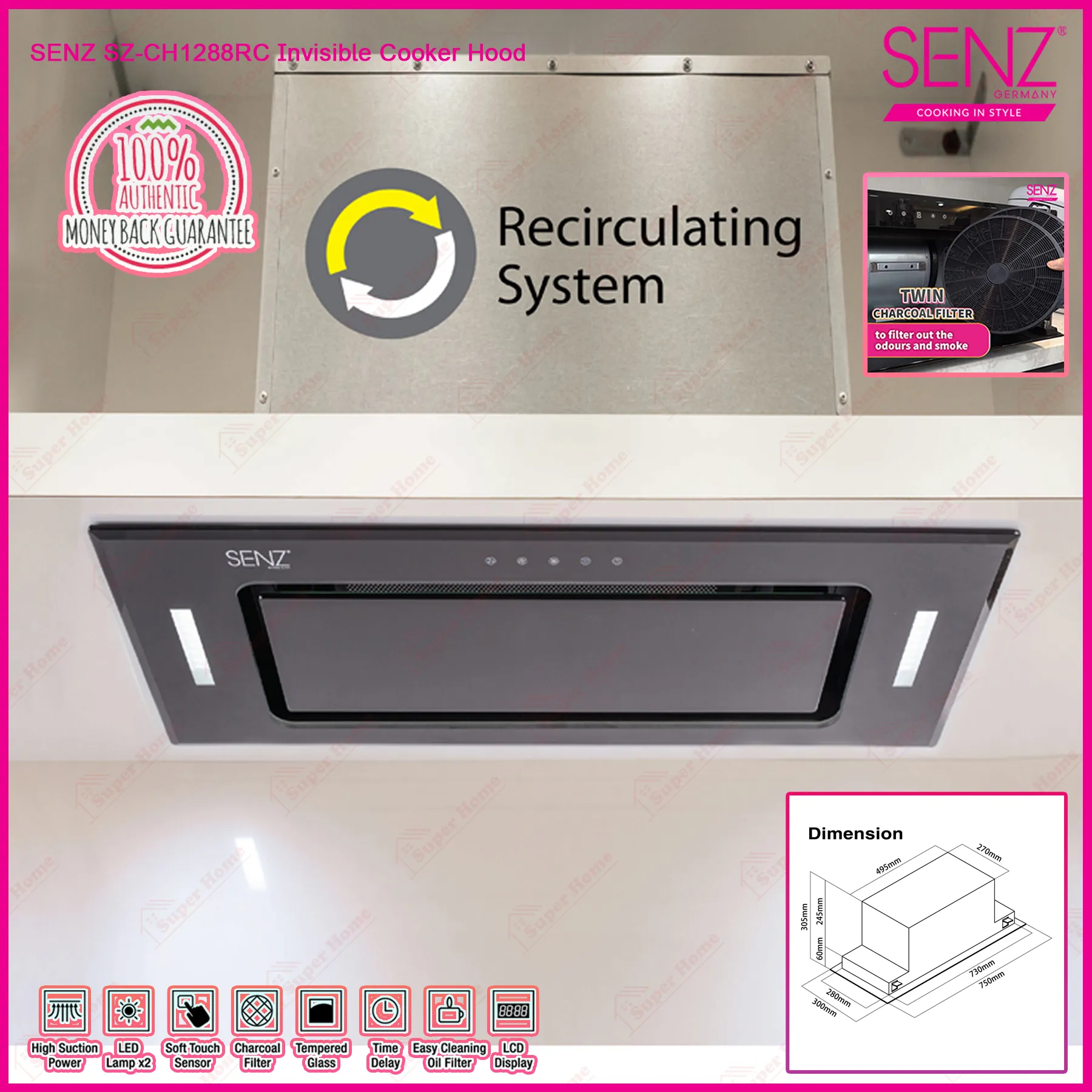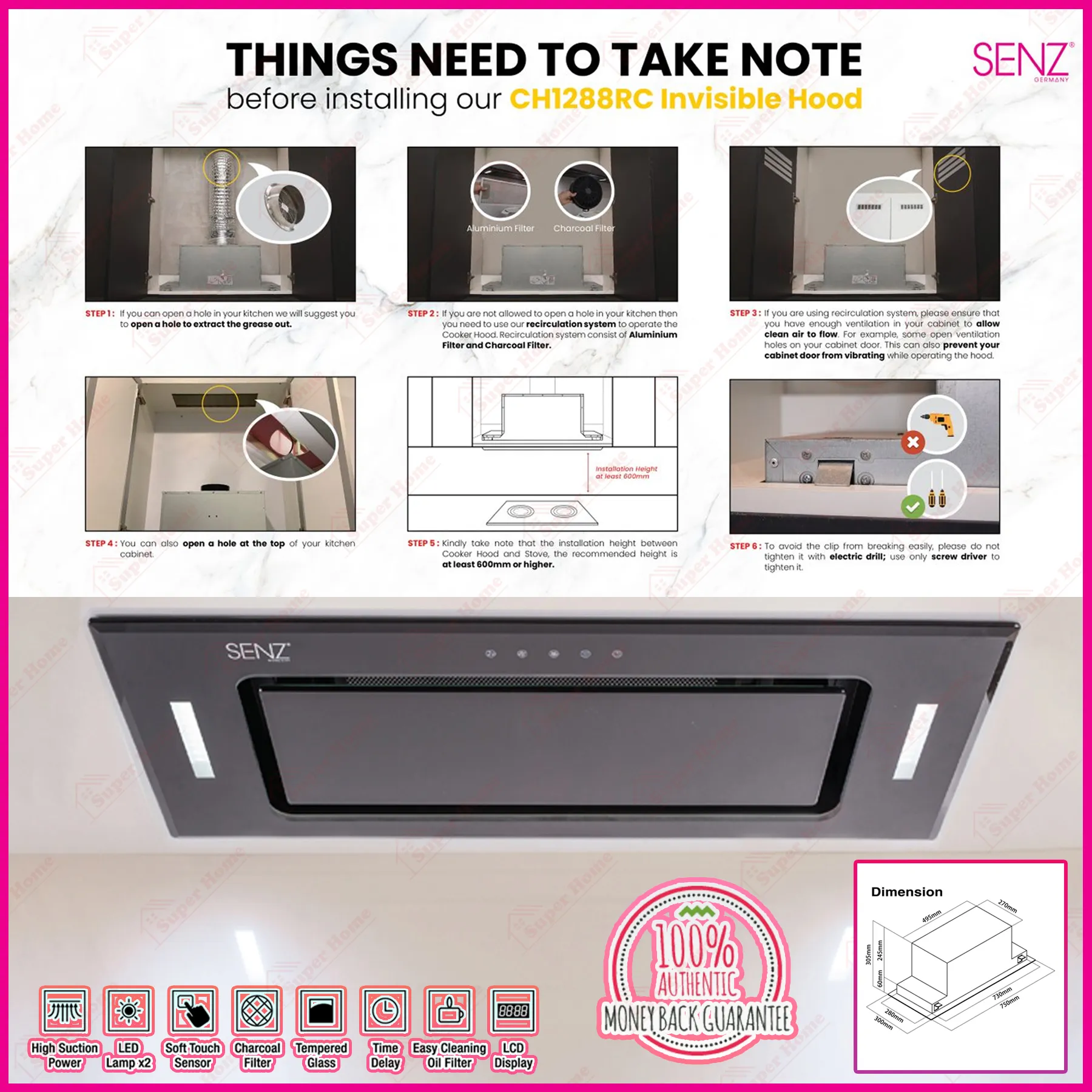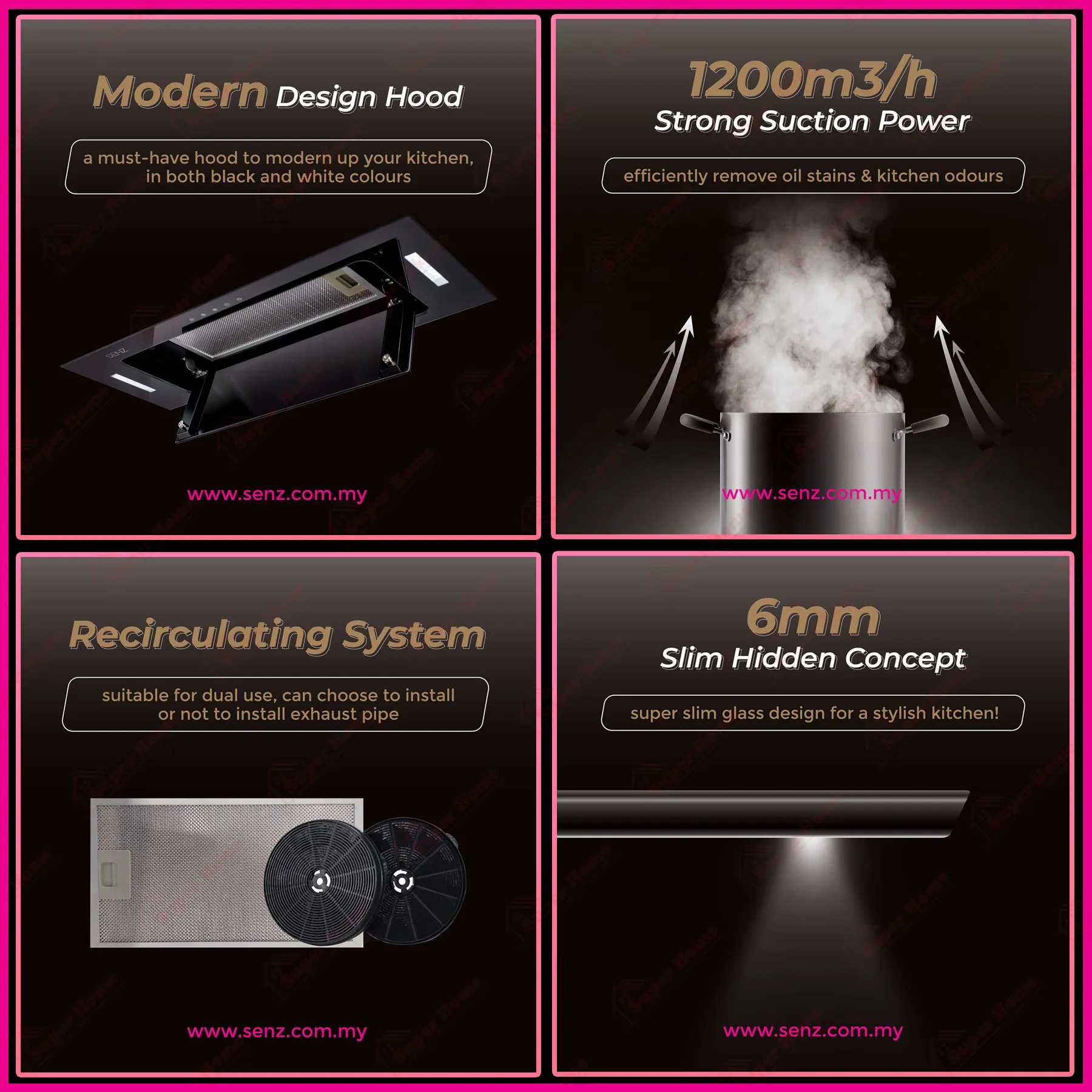 1 x Senz Invisible Cooker Hood SZ-CH1288RC-B Designer Hood Suction power 1200m3/h (Exhaust / Recirculation option) - Suitable For Recirculation Type