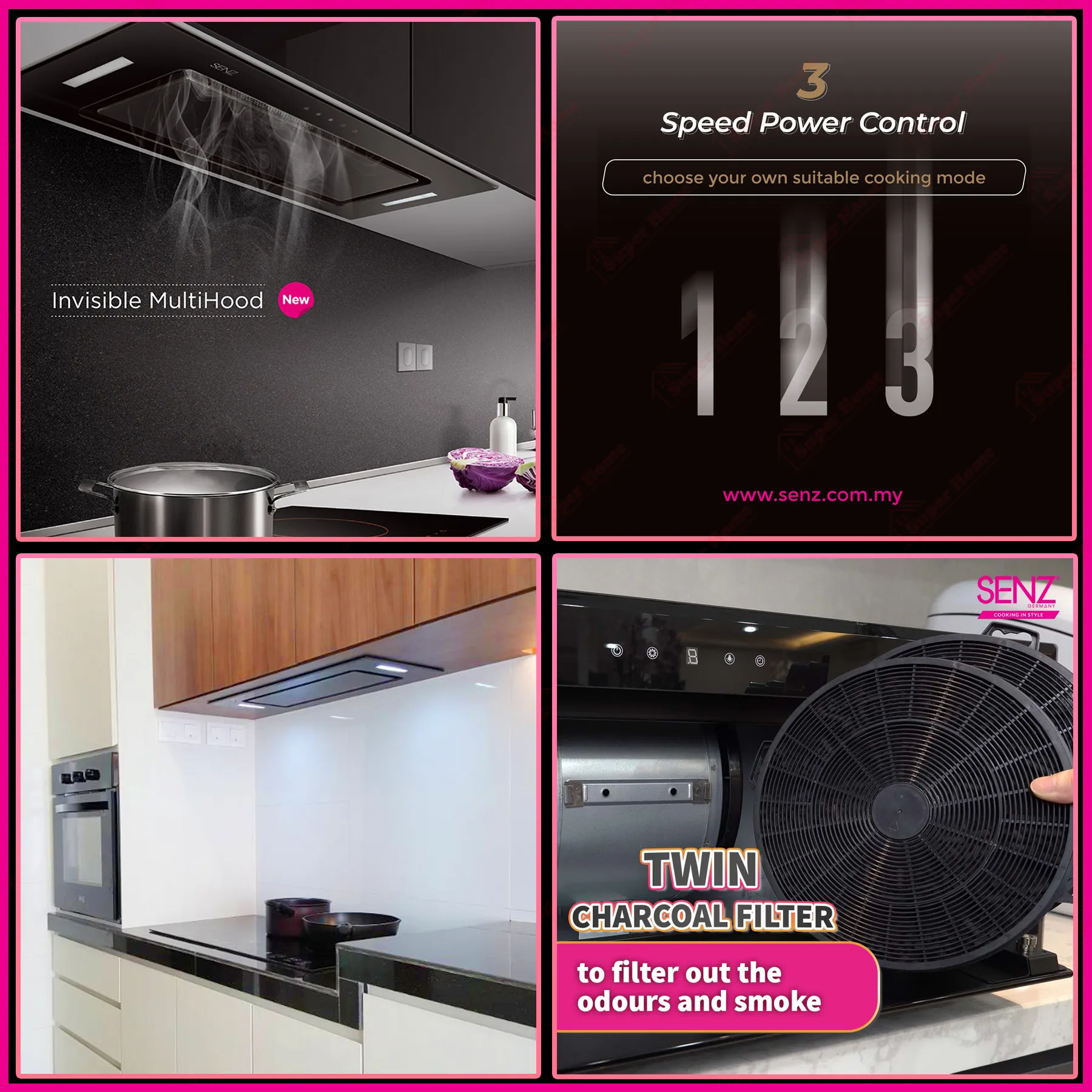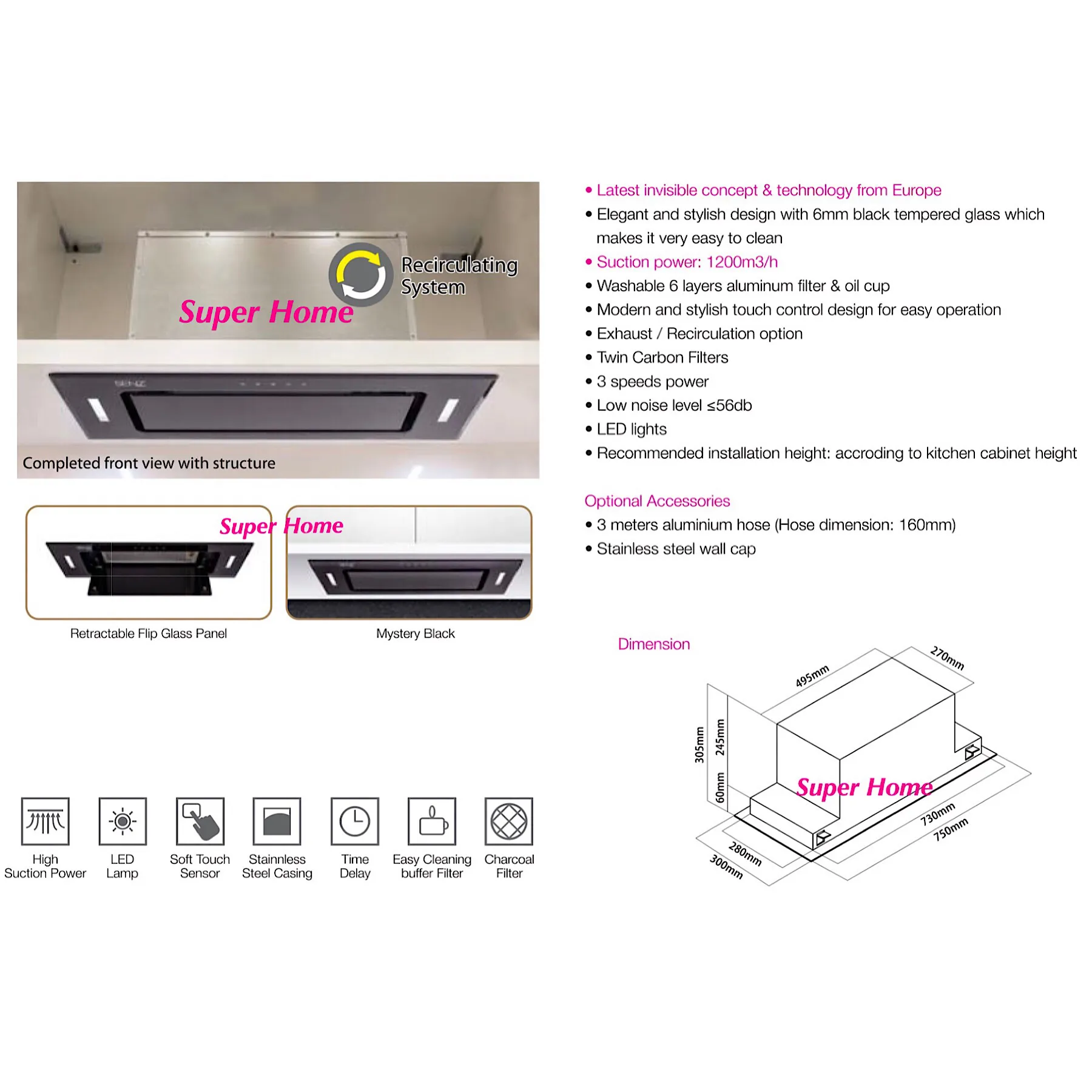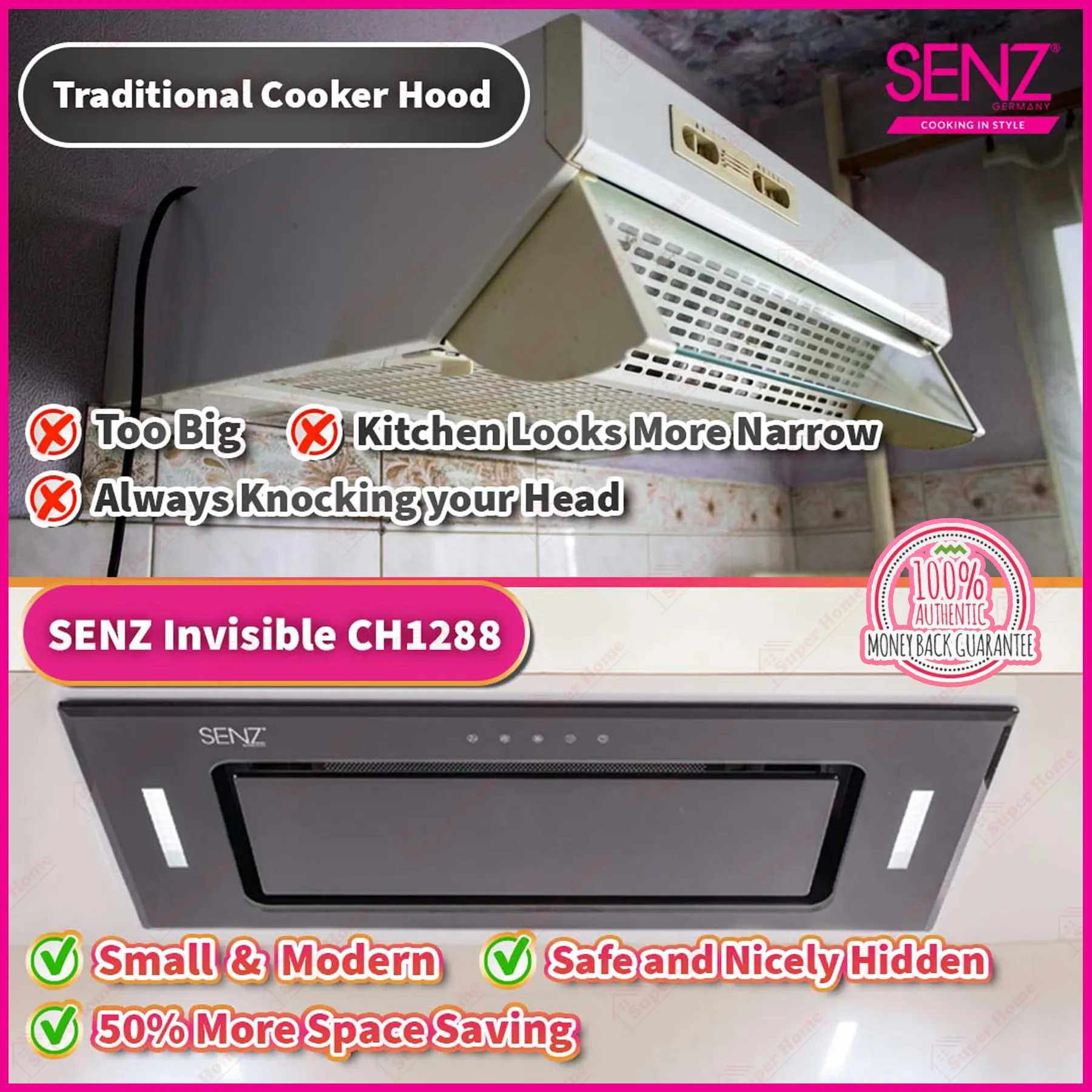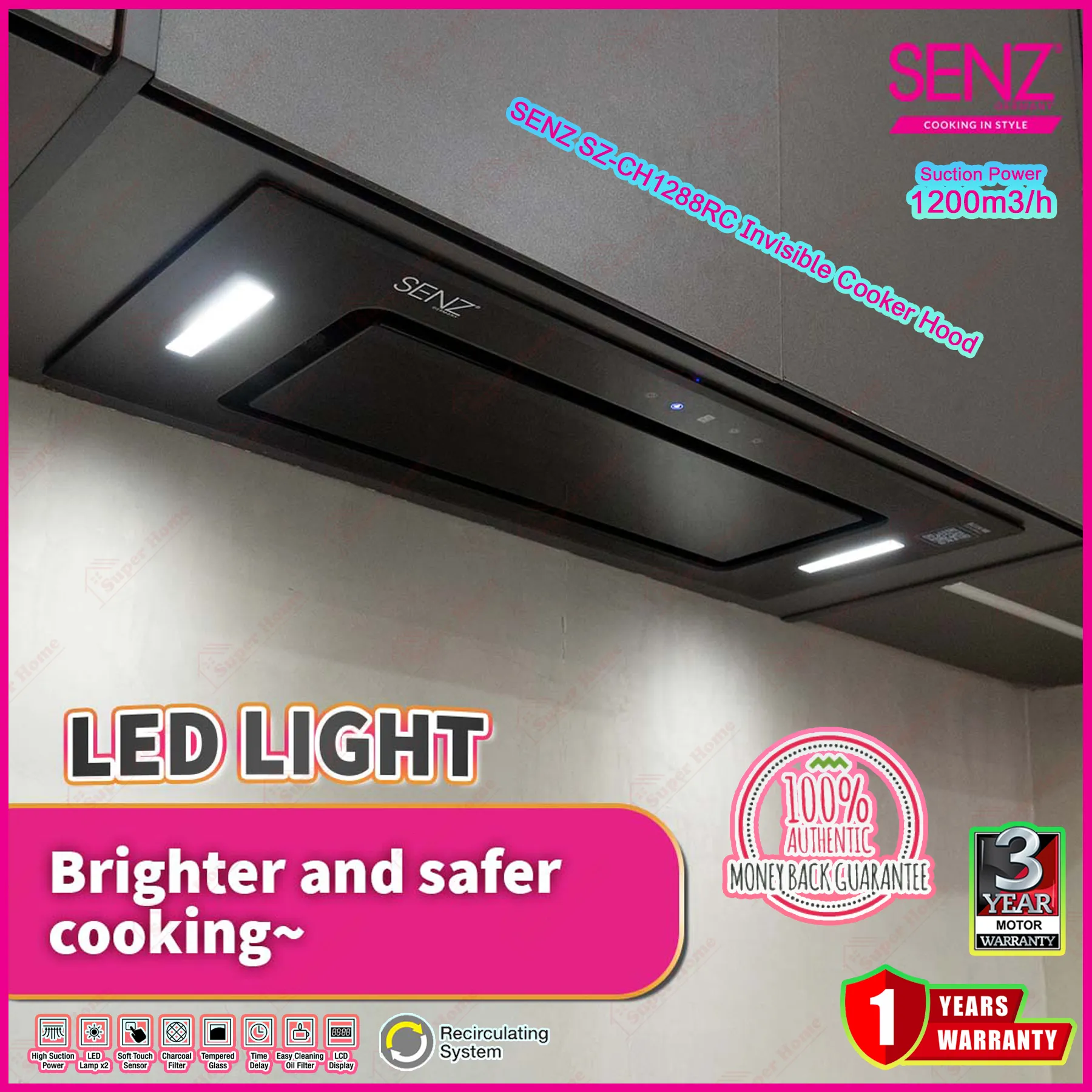 1 x Senz Invisible Cooker Hood SZ-CH1288RC-B Designer Hood Suction power 1200m3/h (Exhaust / Recirculation option) - Suitable For Recirculation Type
