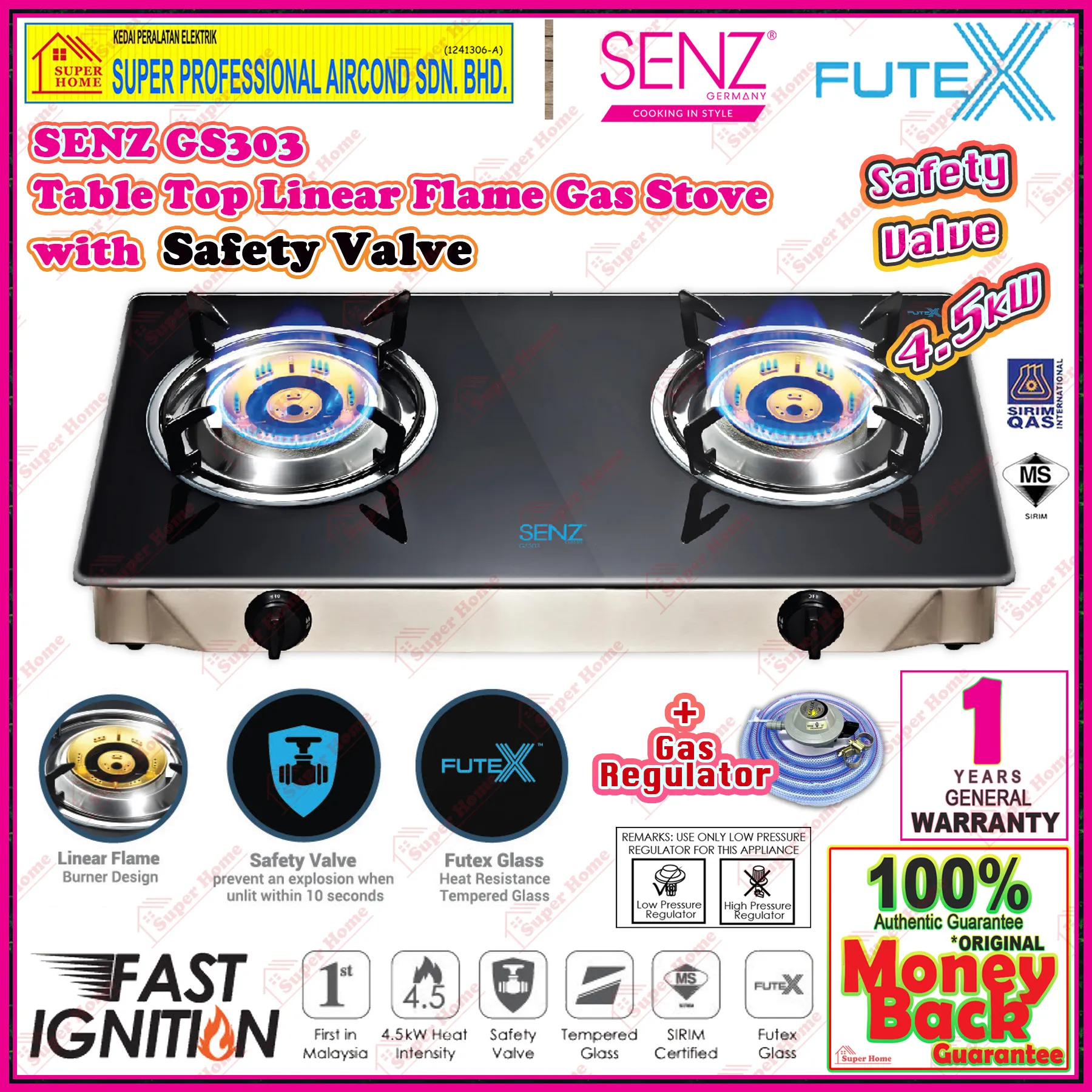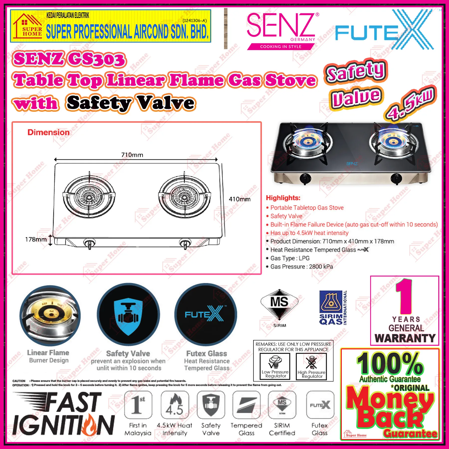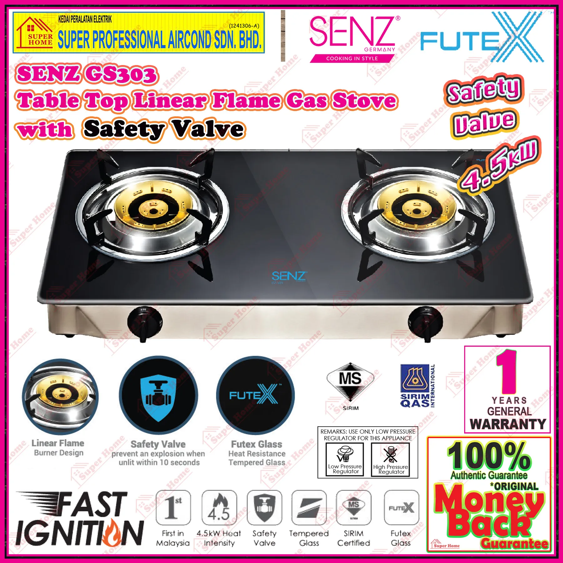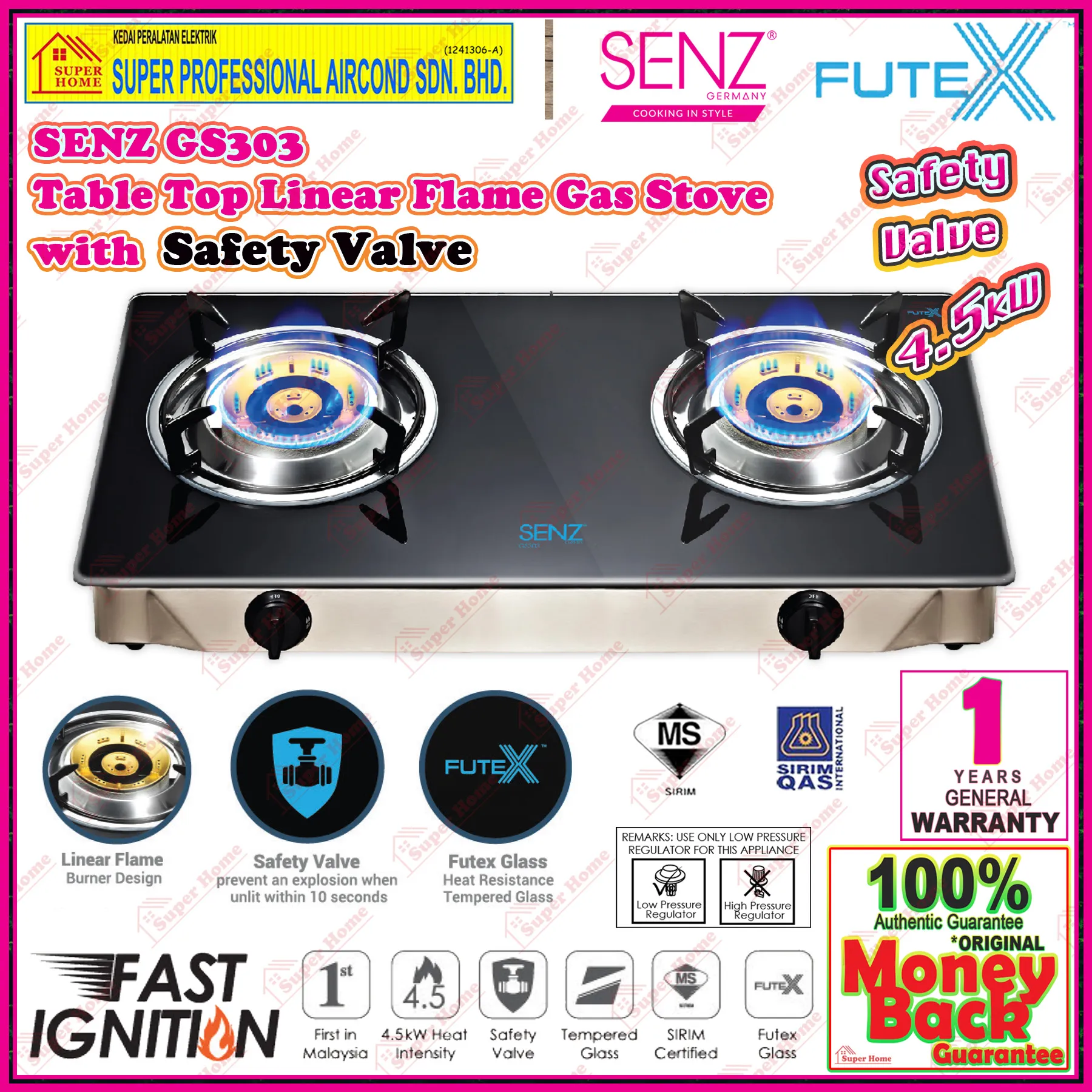 - Built-in Flame Failsure Device (auto gas cut-off within 10 seconds)