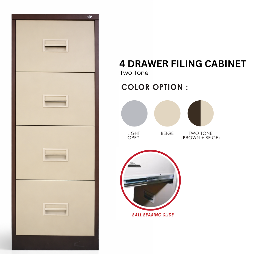 This 4-Drawer Steel Filing Cabinet is designed for organised document storage in offices, schools, and staff work areas. Fully steel constructed with smooth ball bearing slides, it allows easy drawer operation for daily use.