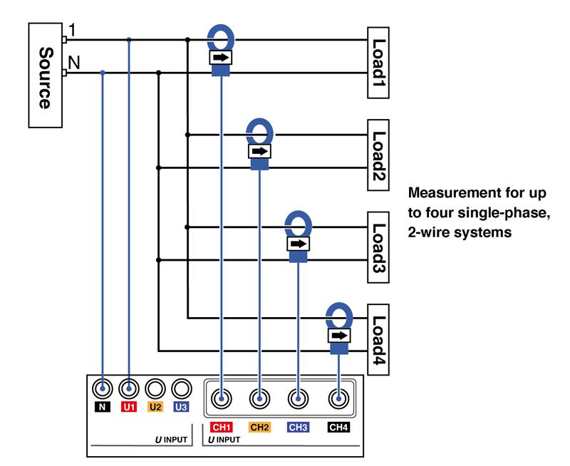 In addition to performing simultaneous measurement for up to four systems (single-phase, 2-wire) with a common voltage, you can set the current range individually for each system. Setting the most suitable current range for both large and small loads allows you to acquire more accurate measurements.