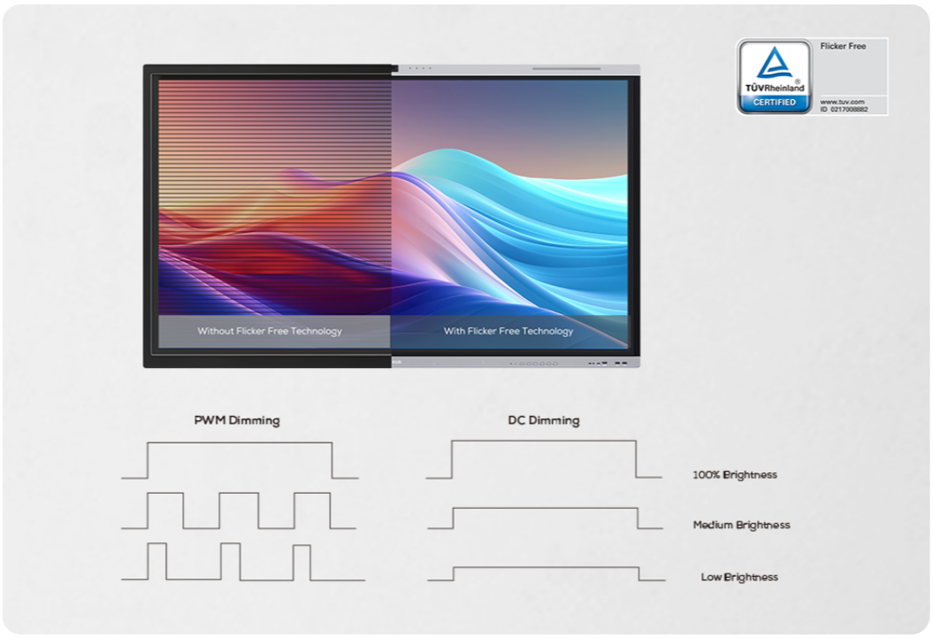 Tired of flickering screens causing eye strain and headaches? Unlike PWM dimming, which uses rapid on/off cycles, DC dimming adjusts brightness directly, eliminating flicker and reducing eye strain. TÜV Flicker-Free certified for superior performance.