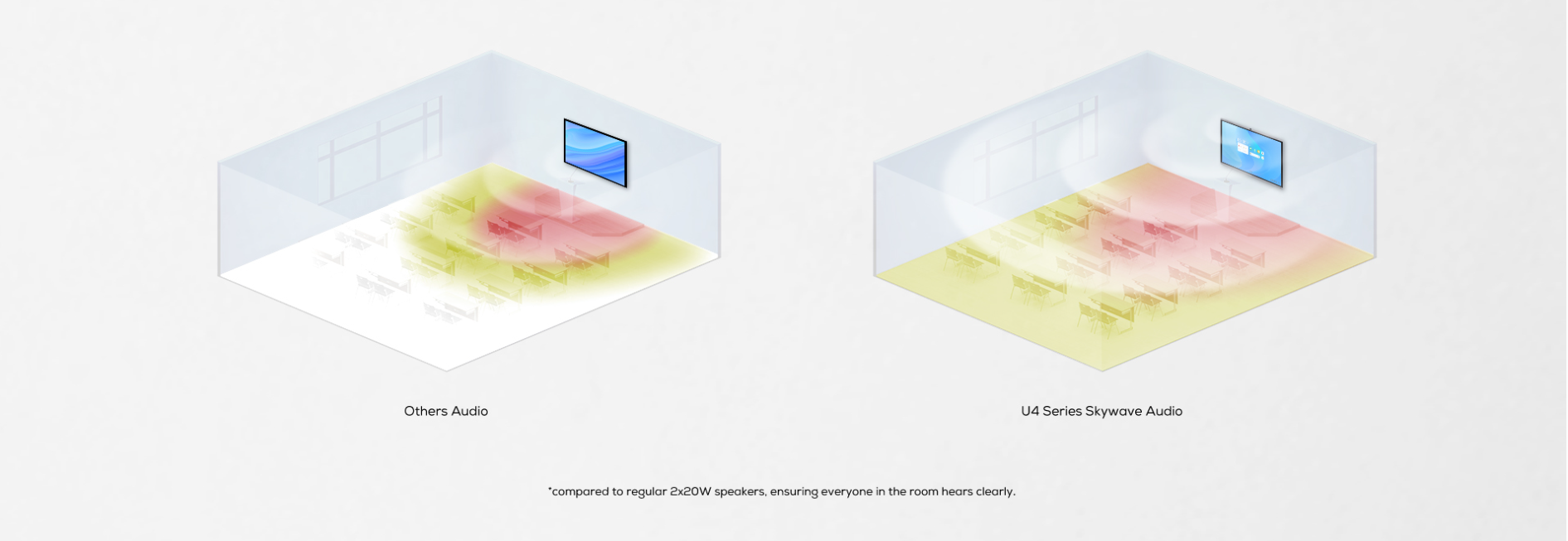 Hear the difference with the MAXHUB Skywave Sound System. Enjoy clear, room-filling audio thanks to its powerful 2.2 channel setup and four speakers (2x12W + 2x25W maximum). Plus experience 4 times* the transmission distance. The built-in microphone ensures your voice is captured with precision, making every meeting or presentation seamless.