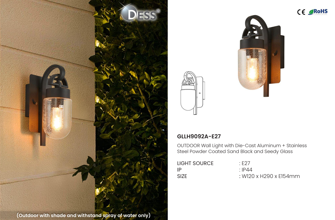 Upgrade your exterior lighting with the DESS GLLH9092A-E27 OUTDOOR WALL LIGHT FITTING IP44, a reliable and stylish lighting fixture designed for both residential and commercial outdoor applications. Built for durability and everyday performance, this wall light fitting is ideal for entrances, corridors, balconies, patios, and perimeter walls.