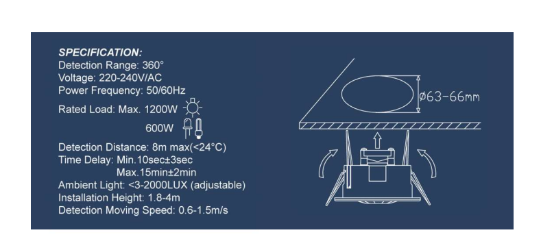 Operating at 240V, the MS41R is designed for reliable indoor use with an IP20 rating. Its recessed mounting design allows for a sleek, seamless installation in ceilings or walls, making it ideal for spaces where aesthetics are important.