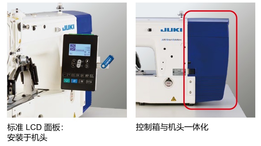 采用了原由 JUKI 设计的与机头一体化的控制箱。标准图案数量为 100 个。最多可在内存中存储 999 个图案(500,000 针)。新型直立式操作面板安装在机头侧面,使操作员在缝制加固缝时无需移开视线即可操作机器。此外,桌面空间可以得到更广泛的使用。操作面板也可像以前一样安装在工作台上。