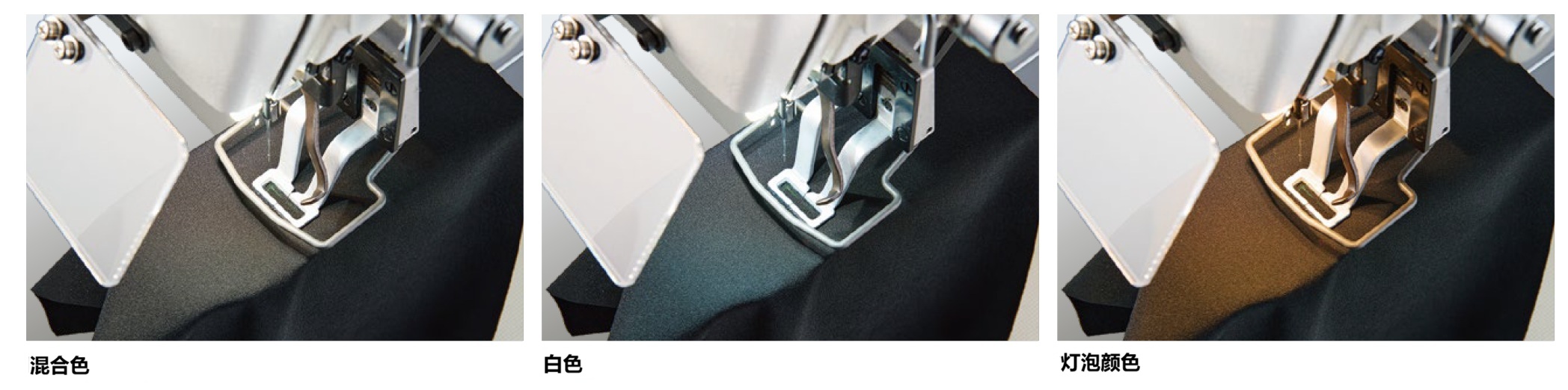 - LED 手灯现在除了传统的调光功能外,还提供双色(白色/灯泡色)色彩匹配功能。照明可调节为五个等级,调光可分为十个等级,以帮助减少长时间从事缝纫操作的操作员的眼睛疲劳。