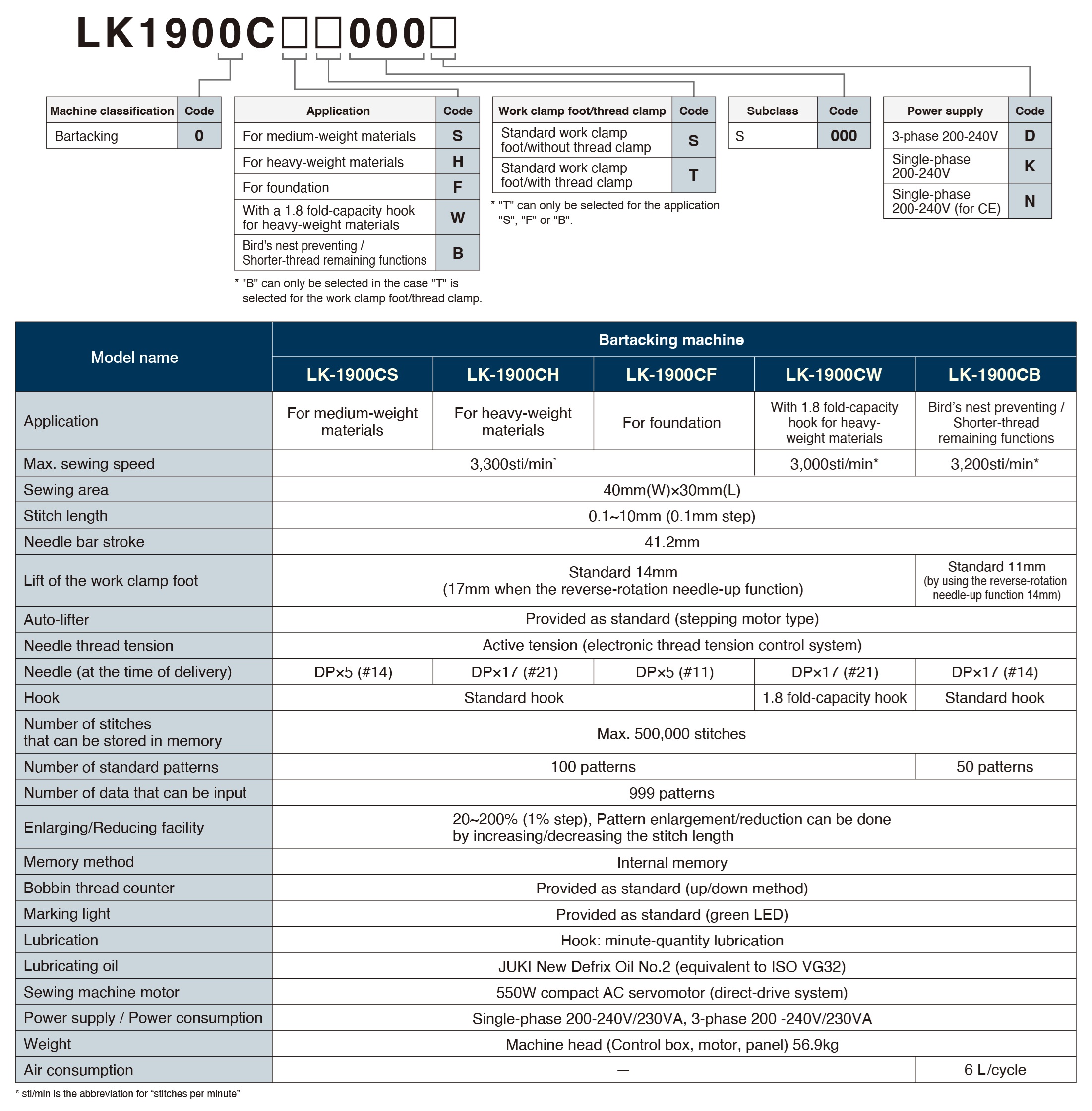 - LK-1900C 型号有五种不同子型号,包括 S 型(标准型)、H 型(用于厚重材料)、F 型(用于底料)、W 型(采用 1.8 倍容量钩用于厚重材料)和 B 型(防鸟巢/短线残留功能),可根据不同应用进行选择。