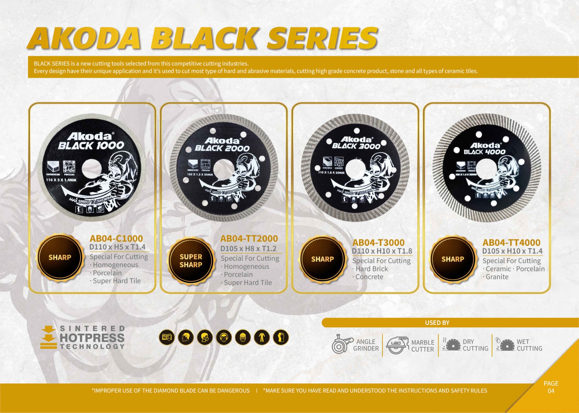 BLACK SERIALS is a new cutting tools selected from this competitive cutting industryes. Every design have their unique application and it's used to cut most tyep of hard and abrasive materials, cutting high grade concrete product, stone and all tyep of ceramic tiles.
