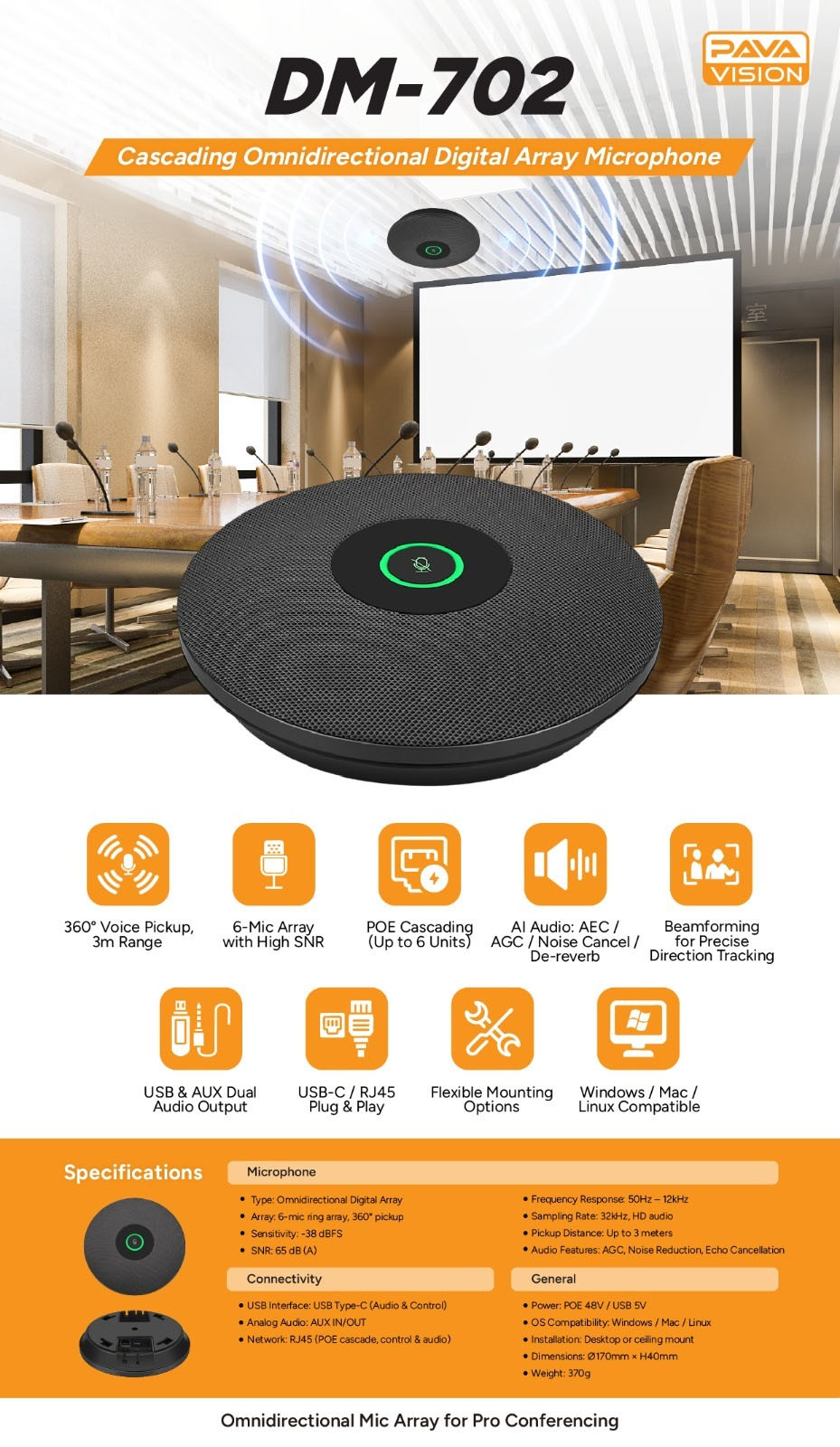 The PAVA VISION DM702 is a professional 360° omnidirectional digital array microphone designed for enterprise conferencing, smart classrooms, and scalable AV systems. Featuring a built-in 6-microphone ring array and AI-powered audio processing, it delivers clear, high-intelligibility voice capture across medium to large meeting spaces.