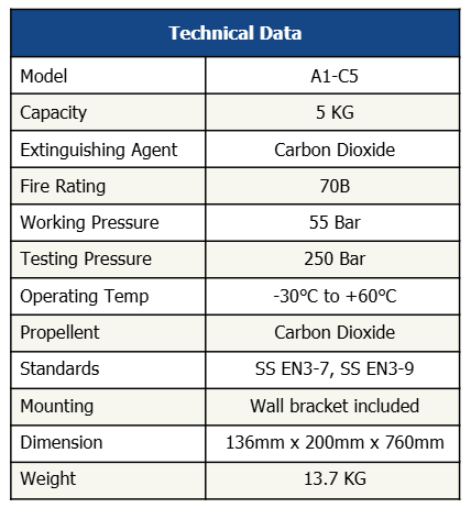 The 5KG carbon dioxide extinguisher is suitable for construction sites, heavy industries, large vehicles, and areas requiring a higher coverage against incipient fires. Backed with a local manufacturing guarantee of 5 years against factory defects.