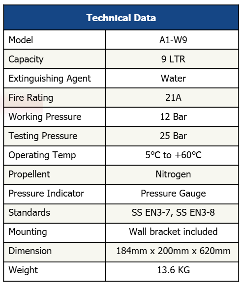 The 9L water fire extinguisher is suitable for construction sites, heavy industries, large vehicles, and areas requiring a higher coverage against incipient fires. Backed with a local manufacturing guarantee of 5 years against factory defects.
