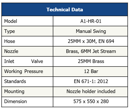 Our Fire Hose Reels are designed for effective first response to Class A fires. Constructed for durability and easy of use, these hose reels provide a controlled supply of water wherever needed. Double 180° Swivel joints to allow withdrawal of hose in any direction. Complete with EN 694 semi rigid hose, hose clip, brass jet nozzle, manual inlet stop valve and nozzle holder.
